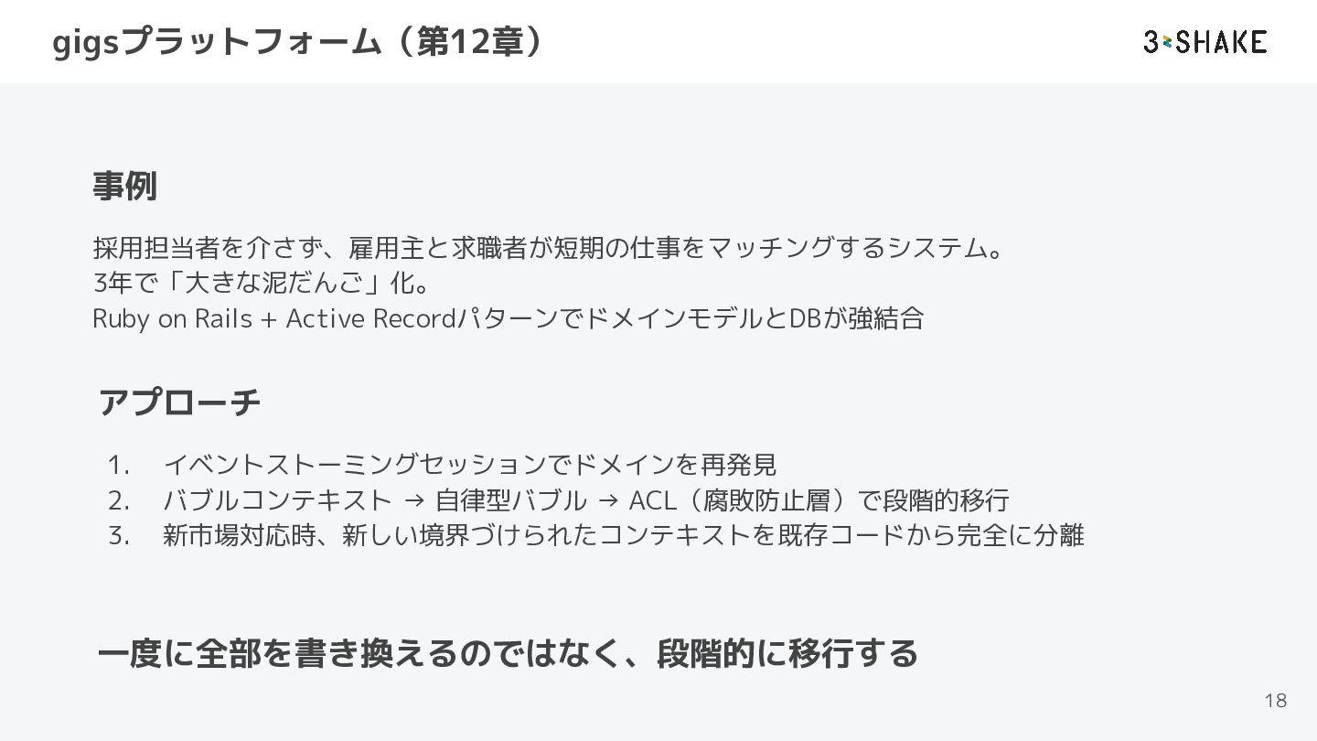 gigsプラットフォーム(第12章) 18 事例 採用担当者を介さず、雇用主と求職者が短期の仕事をマッチングするシステム。 3年で「大きな泥だんご」化。 Ruby on Rails + Active