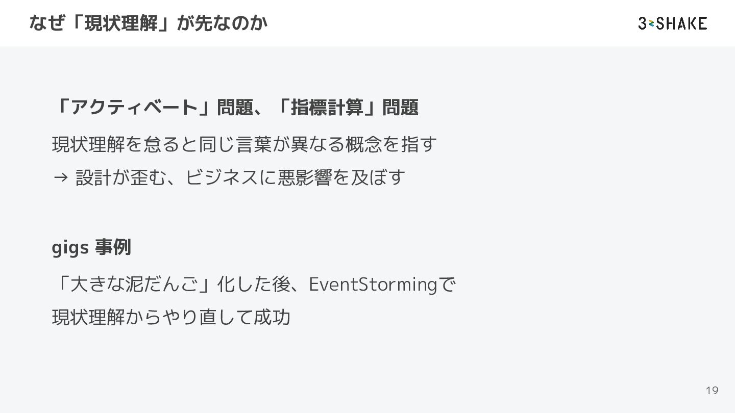 なぜ「現状理解」が先なのか 19 「アクティベート」問題、「指標計算」問題 現状理解を怠ると同じ言葉が異なる概念を指す → 設計が歪む、ビジネスに悪影響を及ぼす gigs 事例 「大きな泥だんご」化した後、EventStormingで 現状理解からやり直して成功
