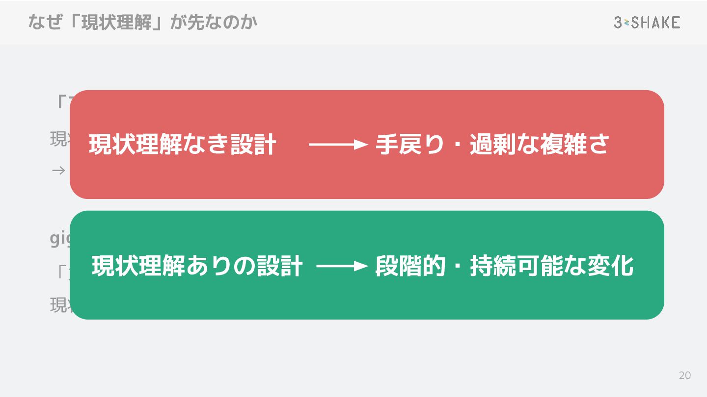 現状理解なき設計 手戻り・過剰な複雑さ 現状理解ありの設計 段階的・持続可能な変化