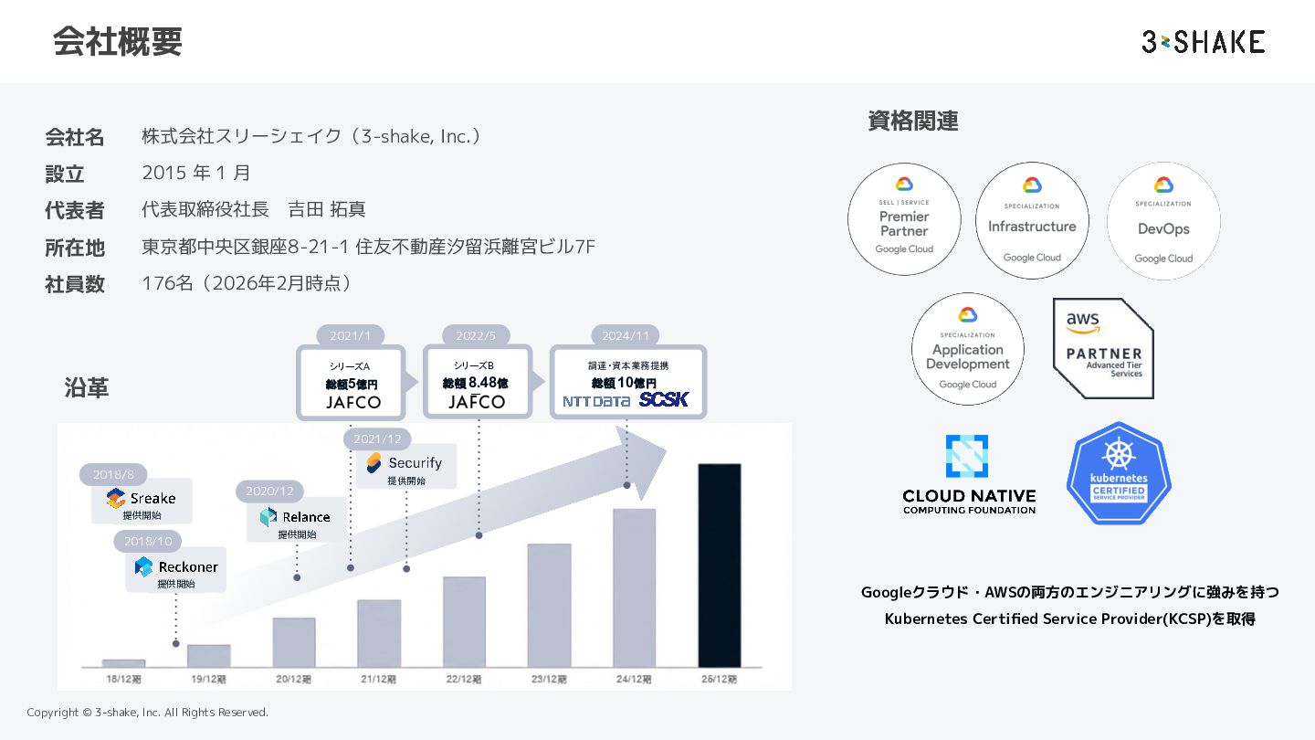 設立 2015 年 1 月 代表者 代表取締役社長 吉田 拓真 所在地 東京都中央区銀座8-21-1 住友不動産汐留浜離宮ビル7F 社員数 176名(2026年2月時点) 提供開始 2018/8 シリーズB 総額 8.48億 円 総額 5億円 調達・資本業務提携 総額 10億円 提供開始 提供開始 提供開始 2018/10 2020/12 2021/12 シリーズA 総額5億円 2021/1 2022/5 2024/11 沿革 Googleクラウド・AWSの両方のエンジニアリングに強みを持つ Kubernetes Certified Service Provider(KCSP)を取得 資格関連 会社概要