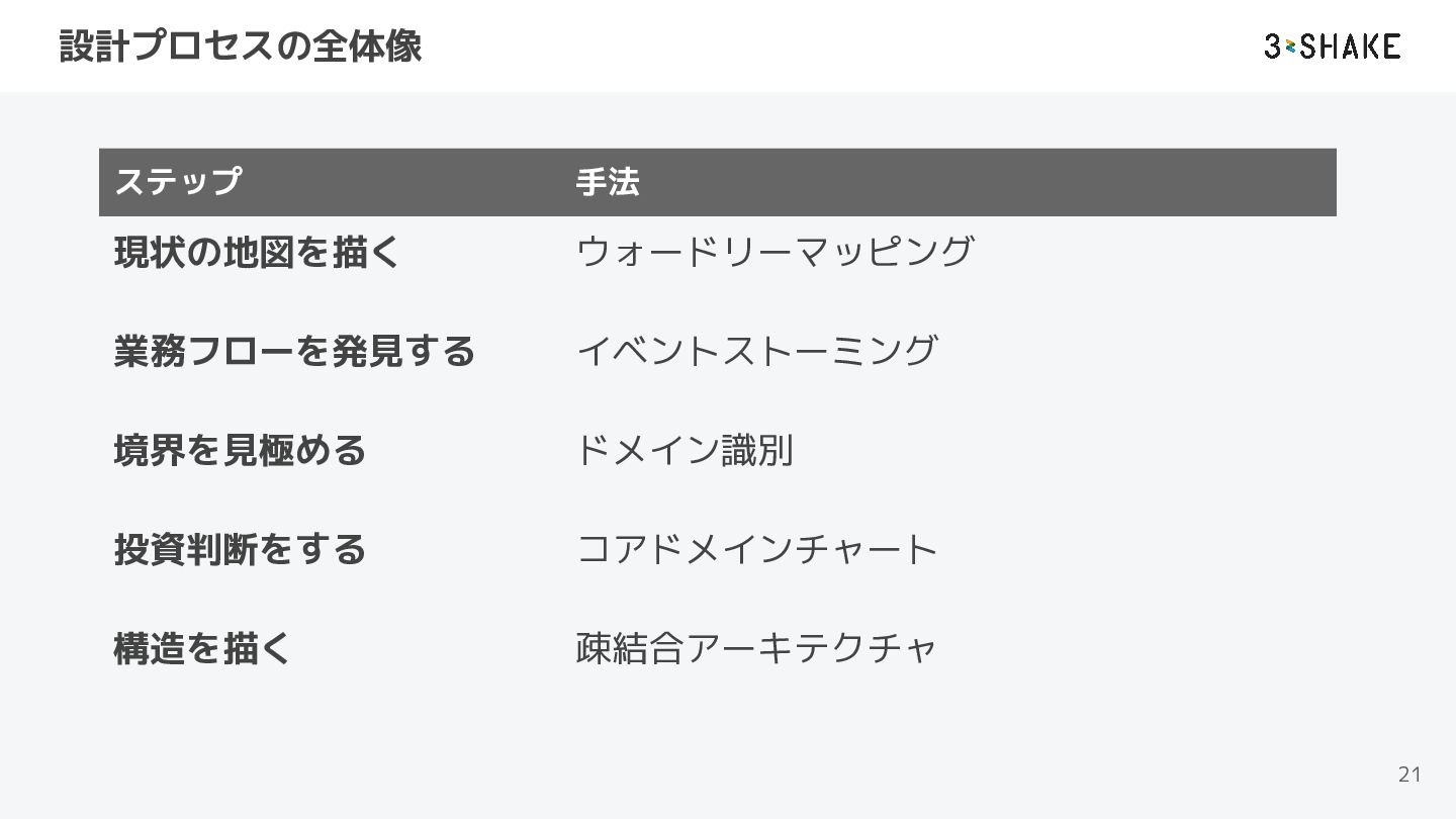 設計プロセスの全体像 21 ステップ 手法 現状の地図を描く ウォードリーマッピング 業務フローを発見する イベントストーミング 境界を見極める ドメイン識別