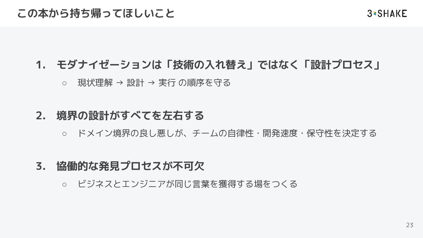 2. 境界の設計がすべてを左右する ◦ ドメイン境界の良し悪しが、チームの自律性・開発速度・保守性を決定する 3. 協働的な発見プロセスが不可欠 ◦ ビジネスとエンジニアが同じ言葉を獲得する場をつくる 23