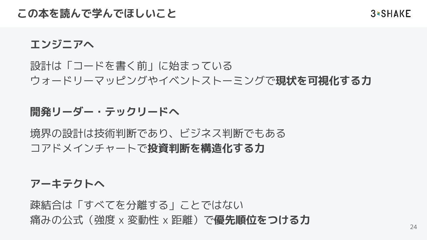 この本を読んで学んでほしいこと 24 エンジニアへ 設計は「コードを書く前」に始まっている ウォードリーマッピングやイベントストーミングで現状を可視化する力 境界の設計は技術判断であり、ビジネス判断でもある コアドメインチャートで投資判断を構造化する力 開発リーダー・テックリードへ 疎結合は「すべてを分離する」ことではない 痛みの公式(強度