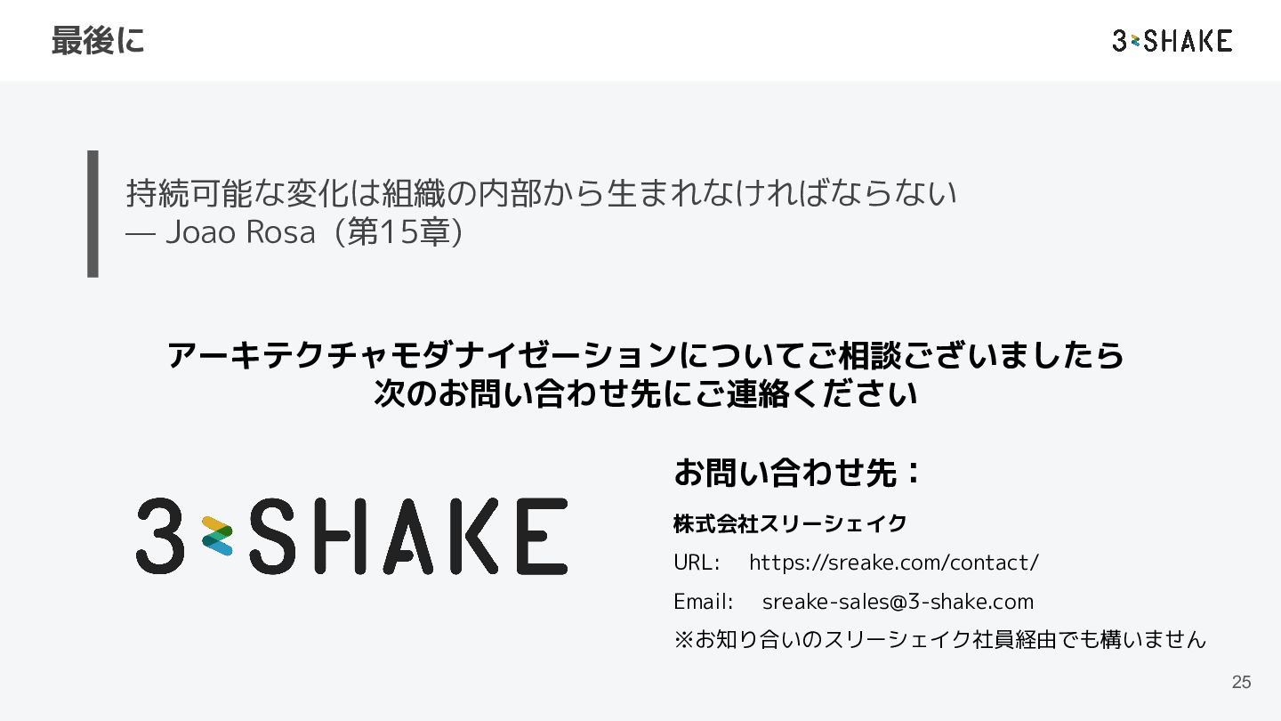 最後に 25 持続可能な変化は組織の内部から生まれなければならない — Joao Rosa (第15章) アーキテクチャモダナイゼーションについてご相談ございましたら 次のお問い合わせ先にご連絡ください お問い合わせ先:
