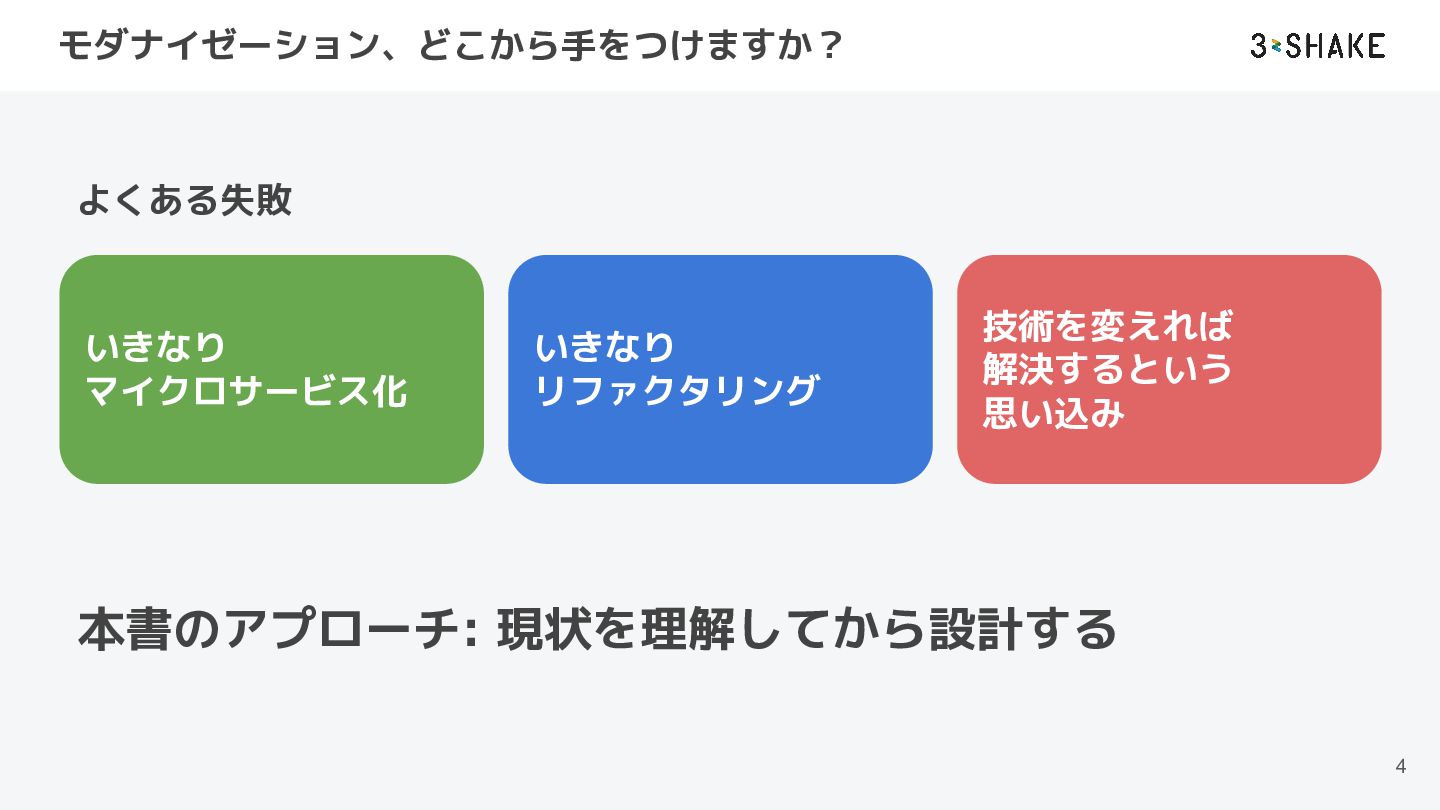 この本から持ち帰ってほしいこと 1. モダナイゼーションは「技術の入れ替え」ではなく「設計プロセス」 ◦ 現状理解 → 設計 → 実行 の順序を守る