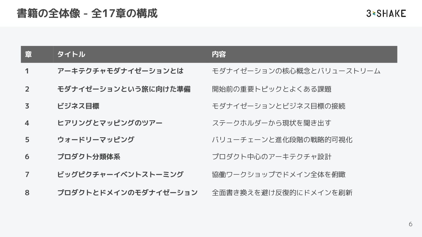 2 モダナイゼーションという旅に向けた準備 開始前の重要トピックとよくある課題 3 ビジネス目標 モダナイゼーションとビジネス目標の接続 4 ヒアリングとマッピングのツアー ステークホルダーから現状を聞き出す 5 ウォードリーマッピング バリューチェーンと進化段階の戦略的可視化 6 プロダクト分類体系 プロダクト中心のアーキテクチャ設計 7 ビッグピクチャーイベントストーミング 協働ワークショップでドメイン全体を俯瞰 8 プロダクトとドメインのモダナイゼーション 全面書き換えを避け反復的にドメインを刷新