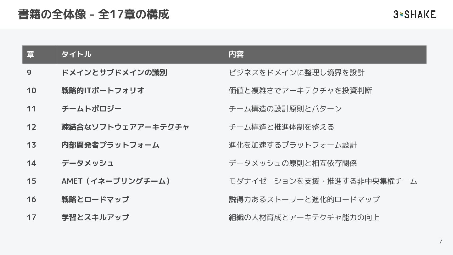 書籍の全体像 - 全17章の構成 7 章 タイトル 内容 9 ドメインとサブドメインの識別 ビジネスをドメインに整理し境界を設計