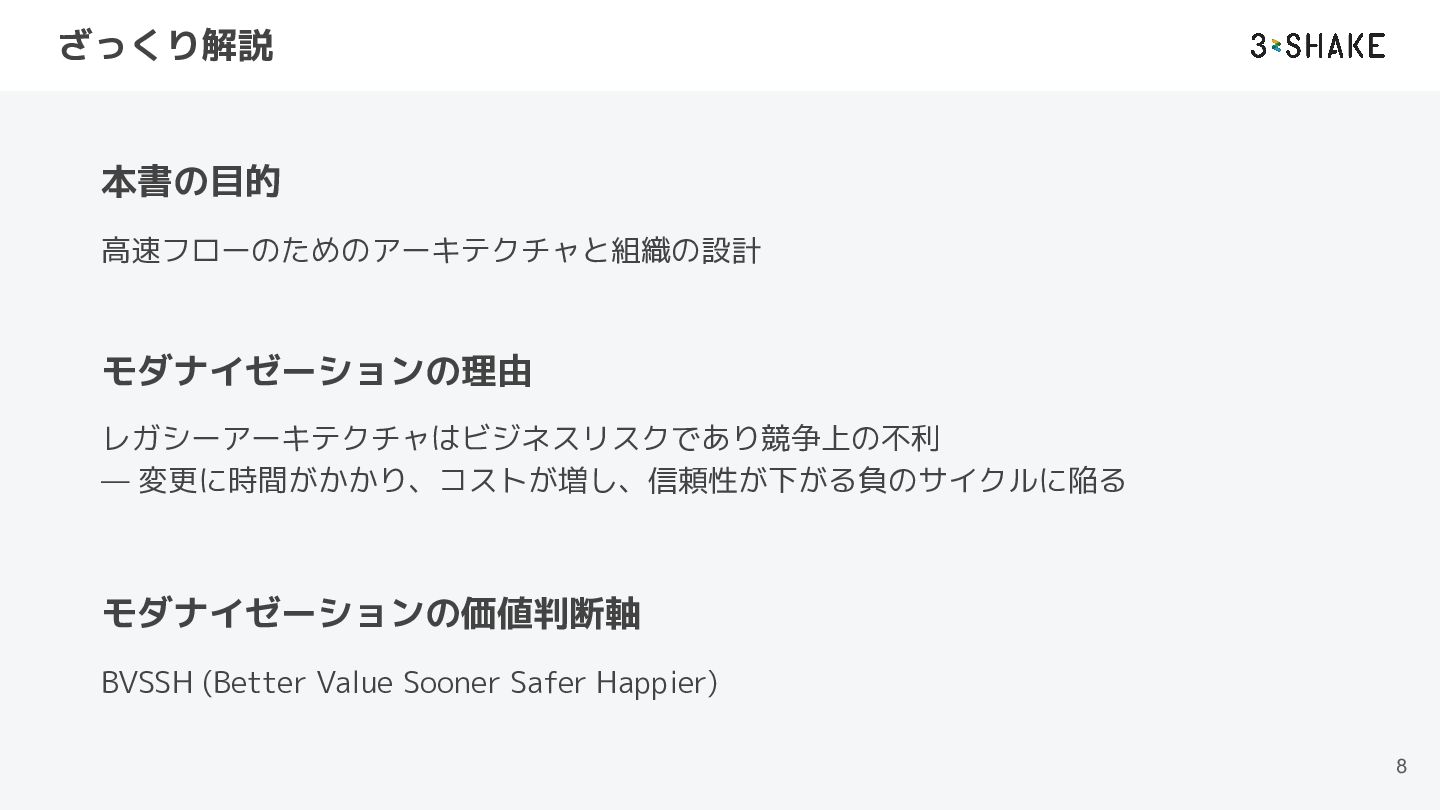 ざっくり解説 8 本書の目的 高速フローのためのアーキテクチャと組織の設計 モダナイゼーションの理由 レガシーアーキテクチャはビジネスリスクであり競争上の不利 — 変更に時間がかかり、コストが増し、信頼性が下がる負のサイクルに陥る モダナイゼーションの価値判断軸 BVSSH
