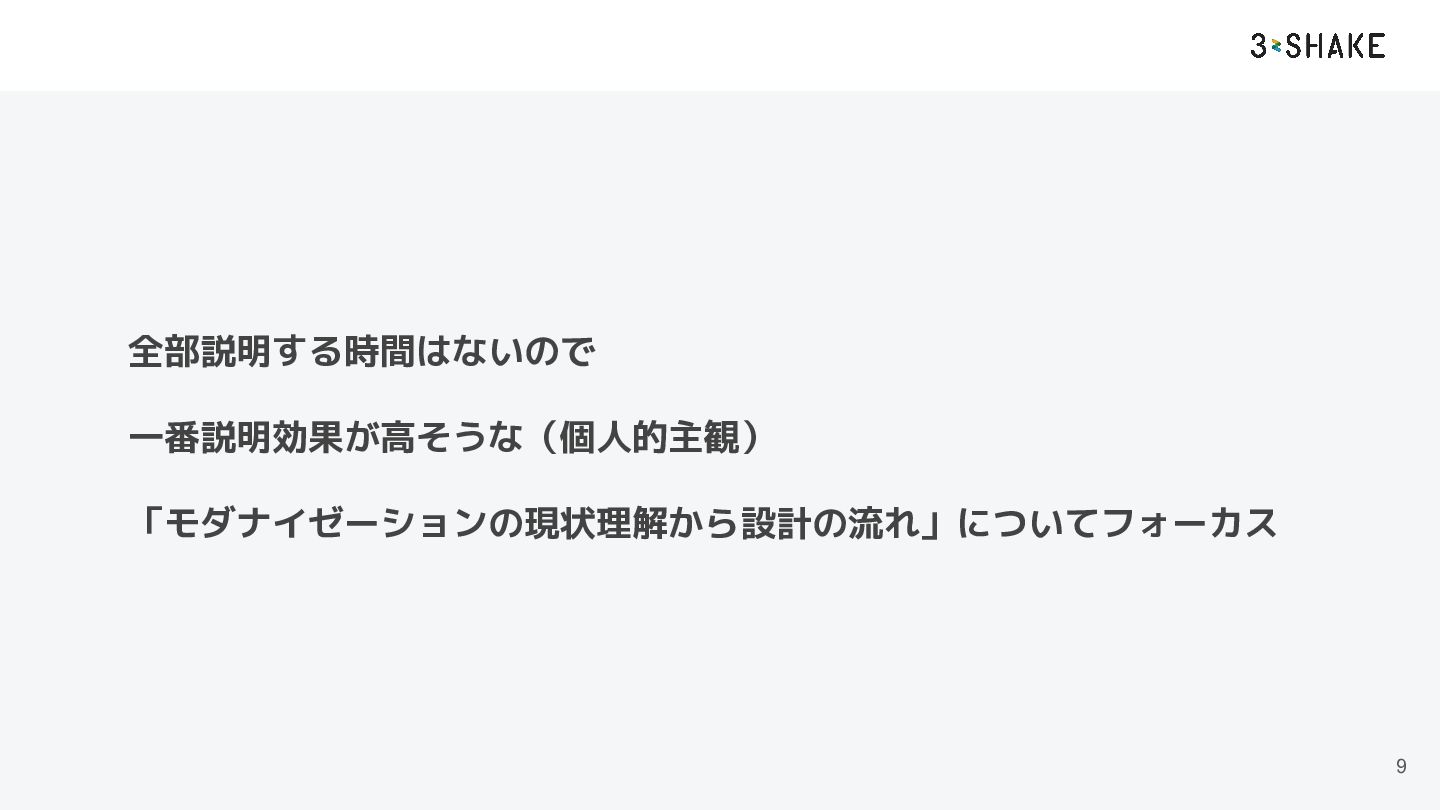 9 全部説明する時間はないので 一番説明効果が高そうな(個人的主観) 「モダナイゼーションの現状理解から設計の流れ」についてフォーカス