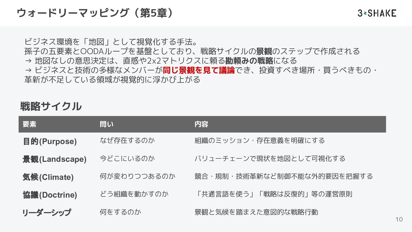 要素 問い 内容 目的(Purpose) なぜ存在するのか 組織のミッション・存在意義を明確にする 景観(Landscape) 今どこにいるのか バリューチェーンで現状を地図として可視化する 気候(Climate) 何が変わりつつあるのか 競合・規制・技術革新など制御不能な外的要因を把握する 協議(Doctrine) どう組織を動かすのか 「共通言語を使う」「戦略は反復的」等の運営原則 リーダーシップ 何をするのか 景観と気候を踏まえた意図的な戦略行動