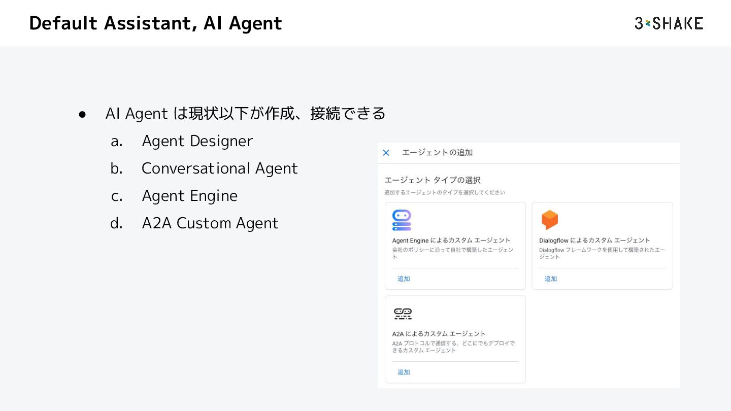 7. Default Assistant, AI Agent • AI Agent は現状以下が作成、接続できる a. Agent