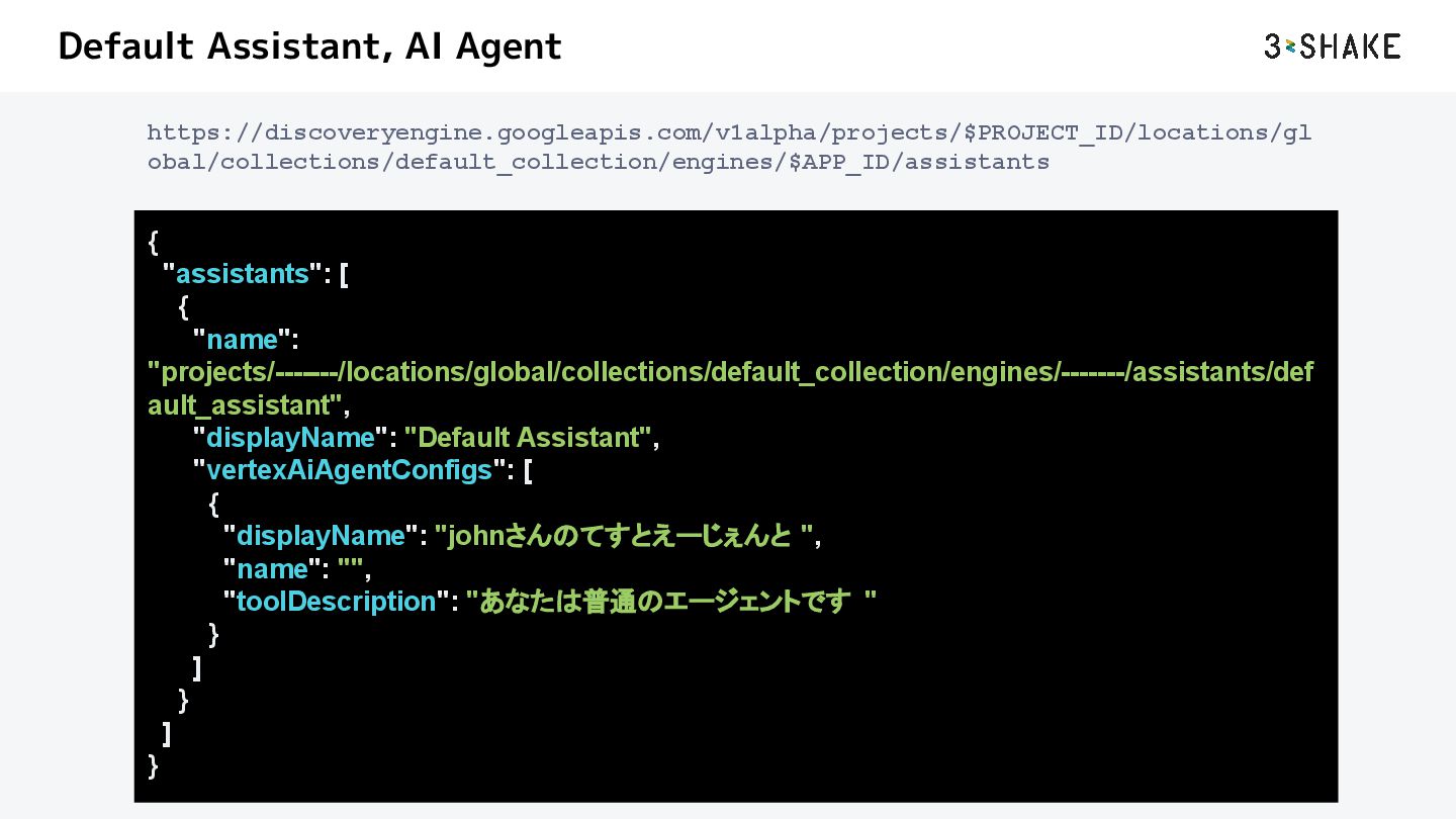ault_assistant", "displayName": "Default Assistant", "vertexAiAgentConfigs": [ { "displayName": "johnさんのてすとえーじぇんと ", "name": "", "toolDescription": "あなたは普通のエージェントです " } ] } ] } https://discoveryengine.googleapis.com/v1alpha/projects/$PROJECT_ID/locations/gl obal/collections/default_collection/engines/$APP_ID/assistants