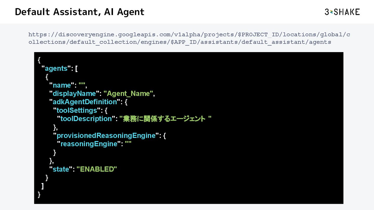 "displayName": "Agent_Name", "adkAgentDefinition": { "toolSettings": { "toolDescription": "業務に関係するエージェント " }, "provisionedReasoningEngine": { "reasoningEngine": "" } }, "state": "ENABLED" } ] } https://discoveryengine.googleapis.com/v1alpha/projects/$PROJECT_ID/locations/global/c ollections/default_collection/engines/$APP_ID/assistants/default_assistant/agents