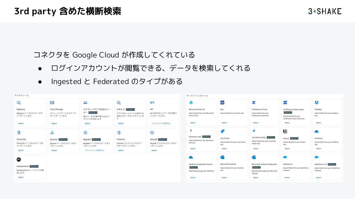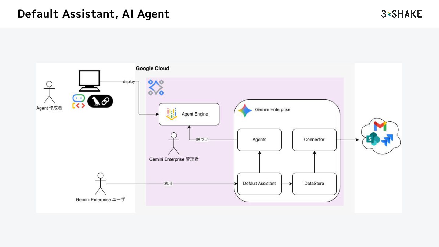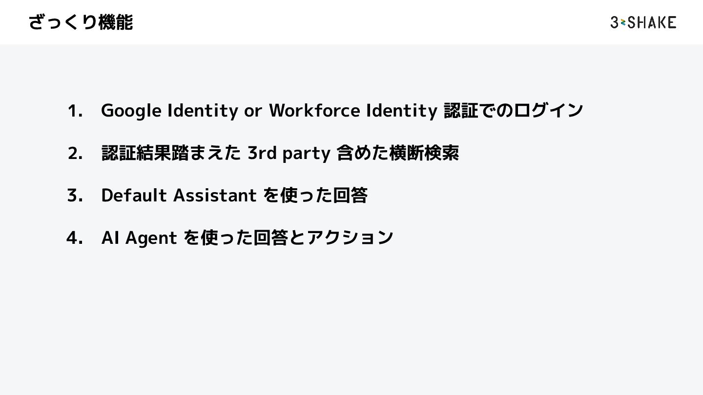 3rd party 含めた横断検索 3. Default Assistant を使った回答 4. AI Agent を使った回答とアクション