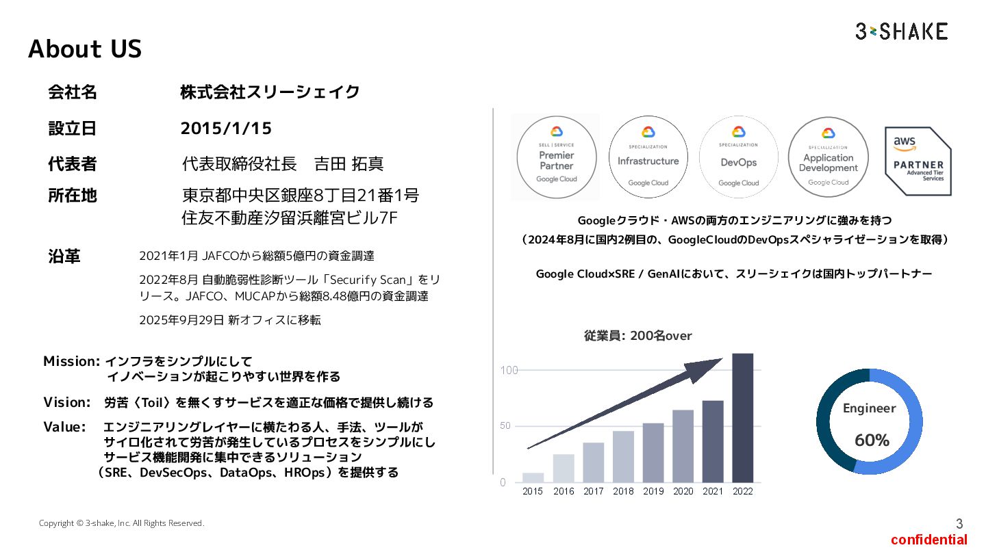 2015/1/15 Mission: インフラをシンプルにして イノベーションが起こりやすい世界を作る confidential 3 About US Vision: 労苦〈Toil〉を無くすサービスを適正な価格で提供し続ける Value: エンジニアリングレイヤーに横たわる人、手法、ツールが サイロ化されて労苦が発生しているプロセスをシンプルにし サービス機能開発に集中できるソリューション (SRE、DevSecOps、DataOps、HROps)を提供する 2015 2016 2017 2018 2019 2020 2021 2022 0 50 100 従業員: 200名over Engineer 60% 所在地 東京都中央区銀座8丁目21番1号    住友不動産汐留浜離宮ビル7F  代表者 代表取締役社長 吉田 拓真 沿革 2021年1月 JAFCOから総額5億円の資金調達 2022年8月 自動脆弱性診断ツール「Securify Scan」をリ リース。JAFCO、MUCAPから総額8.48億円の資金調達 2025年9月29日 新オフィスに移転 Googleクラウド・AWSの両方のエンジニアリングに強みを持つ (2024年8月に国内2例目の、GoogleCloudのDevOpsスペシャライゼーションを取得) Google Cloud×SRE / GenAIにおいて、スリーシェイクは国内トップパートナー