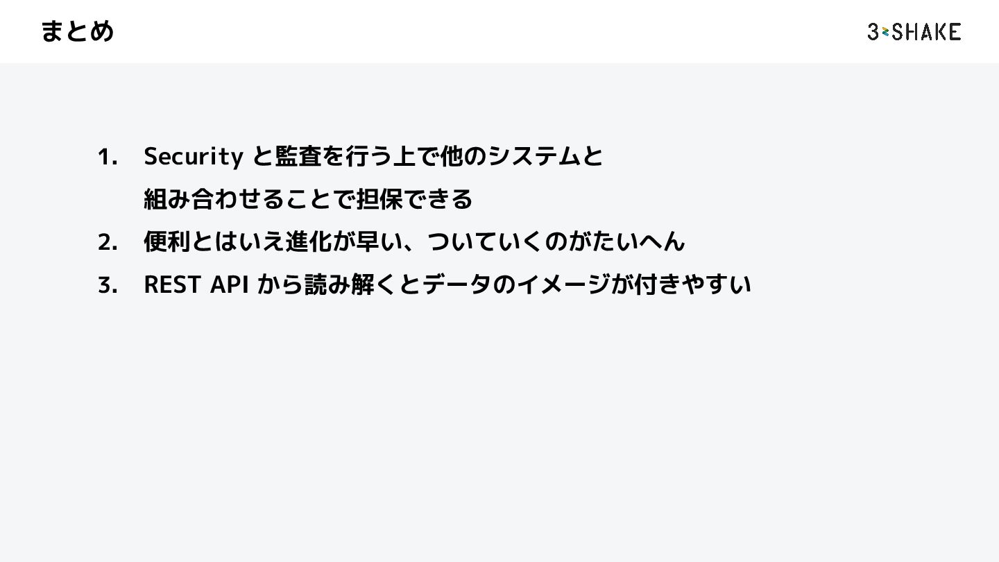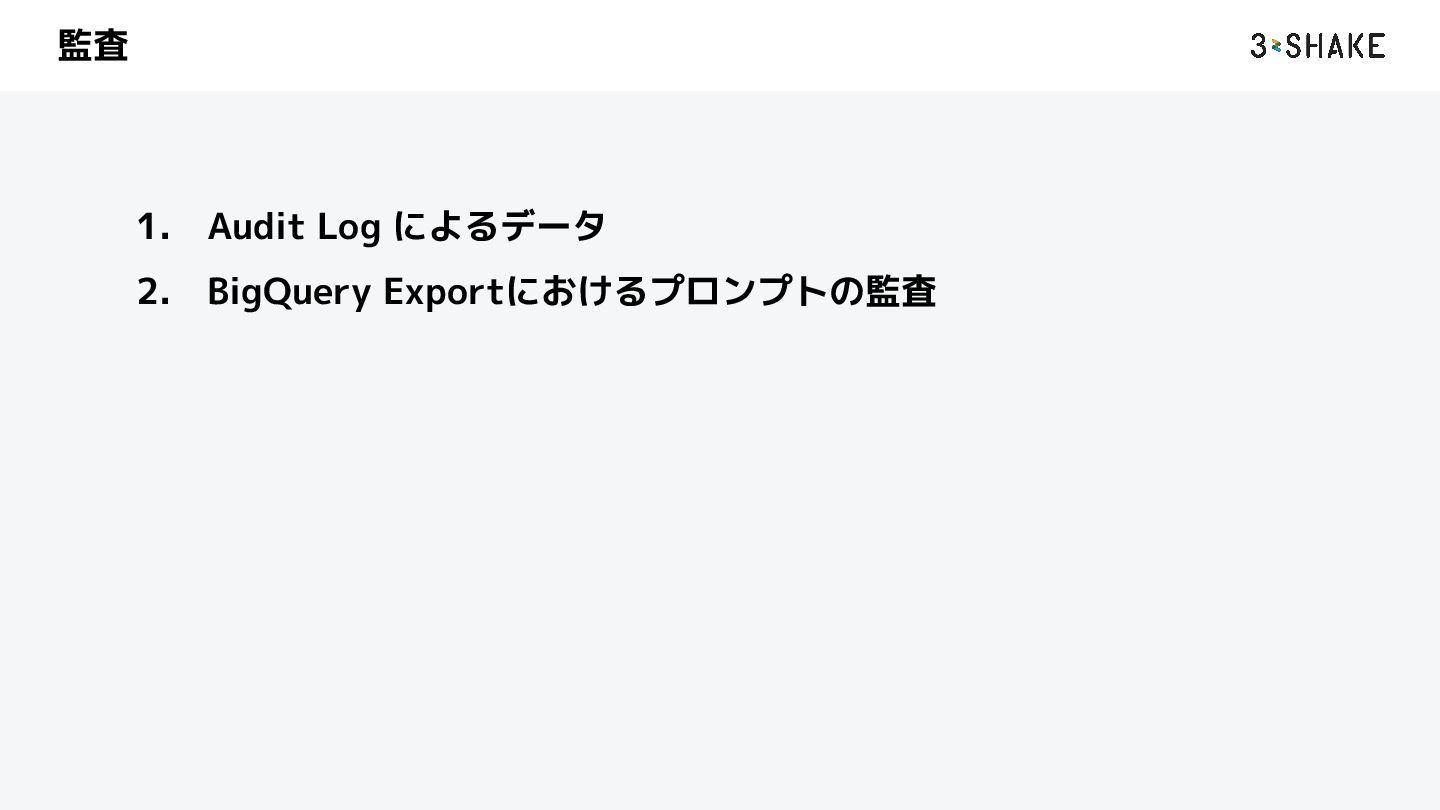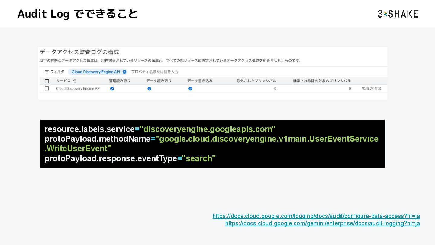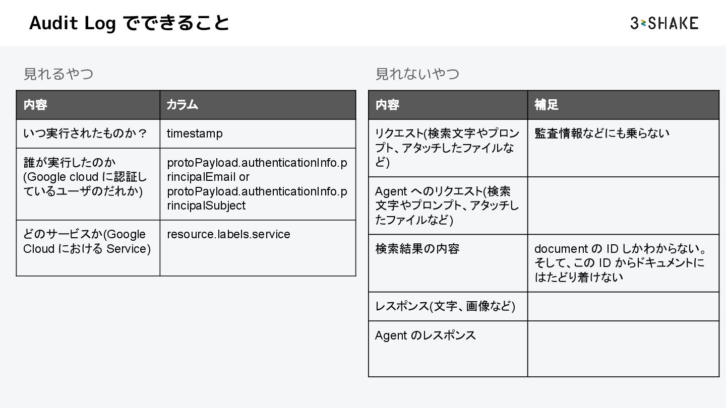 に認証し ているユーザのだれか) protoPayload.authenticationInfo.p rincipalEmail or protoPayload.authenticationInfo.p rincipalSubject どのサービスか(Google Cloud における Service) resource.labels.service 内容 補足 リクエスト(検索文字やプロン プト、アタッチしたファイルな ど) 監査情報などにも乗らない Agent へのリクエスト(検索 文字やプロンプト、アタッチし たファイルなど) 検索結果の内容 document の ID しかわからない。 そして、この ID からドキュメントに はたどり着けない レスポンス(文字、画像など) Agent のレスポンス 見れるやつ 見れないやつ
