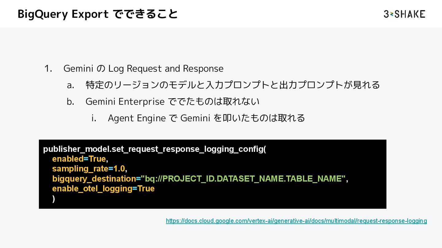 a. 特定のリージョンのモデルと入力プロンプトと出力プロンプトが見れる b. Gemini Enterprise ででたものは取れない i. Agent Engine で Gemini を叩いたものは取れる https://docs.cloud.google.com/vertex-ai/generative-ai/docs/multimodal/request-response-logging publisher_model.set_request_response_logging_config( enabled=True, sampling_rate=1.0, bigquery_destination="bq://PROJECT_ID.DATASET_NAME.TABLE_NAME", enable_otel_logging=True )