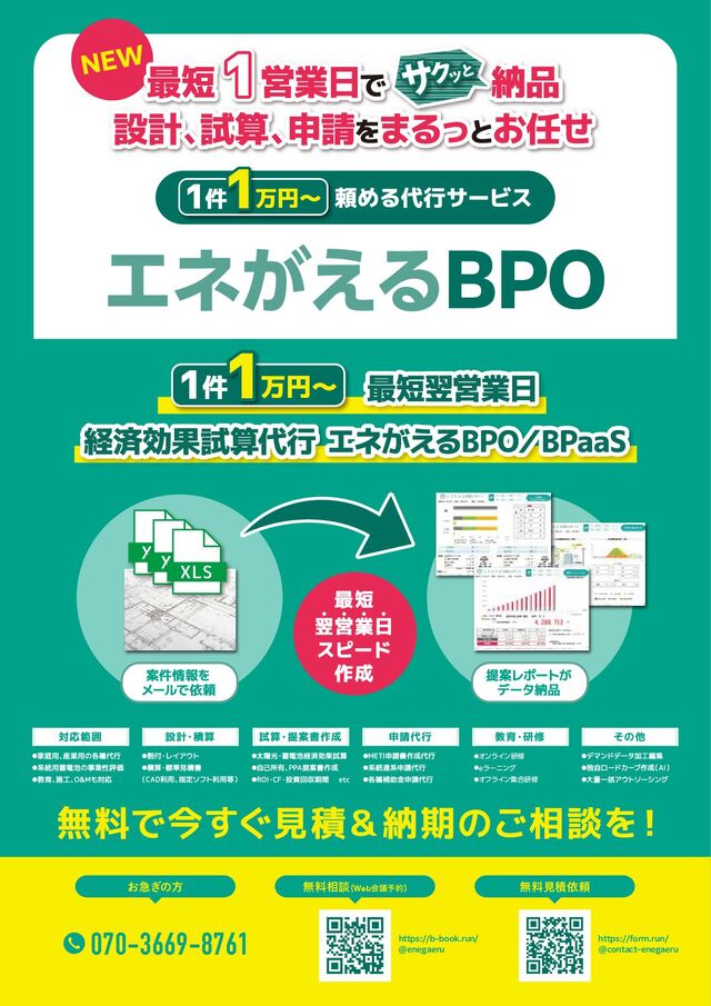 エネがえるBPOリーフレット 太陽光 蓄電池 経済効果試算代行(パネルレイアウト設計、補助金申請書作成、系統連系申請、現地調査・EPC・O&M、教育研修等様々な代行が可) 環境省、自治体、大手メーカー、販売施工店など多数実績あり。