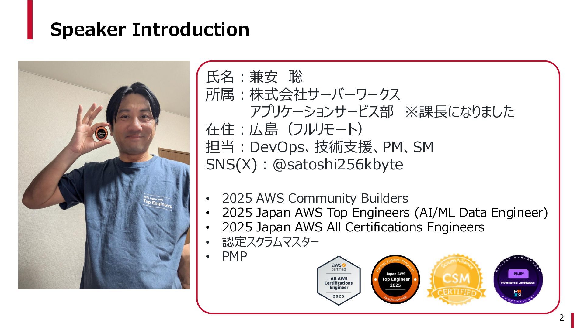 2025 AWS Community Builders • 2025 Japan AWS Top Engineers (AI/ML Data Engineer) • 2025 Japan AWS All Certifications Engineers • 認定スクラムマスター • PMP Speaker Introduction