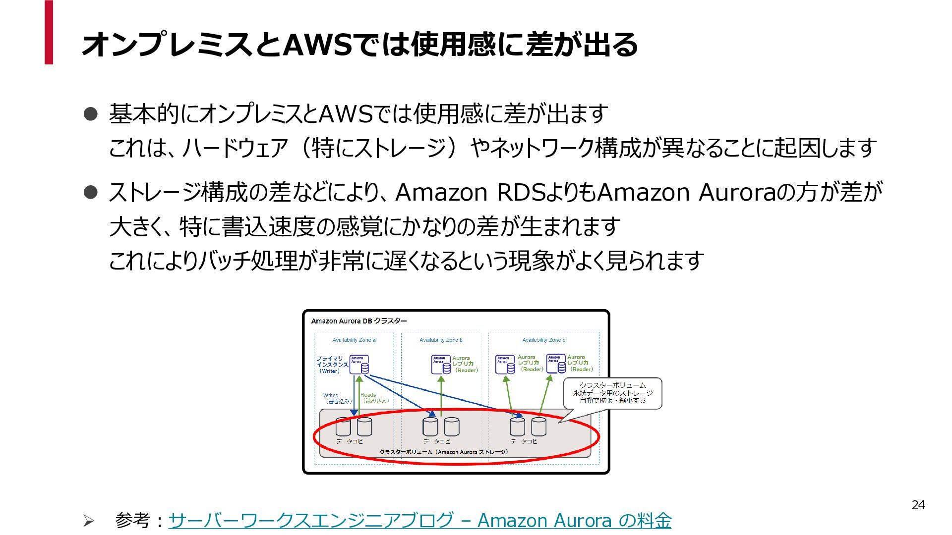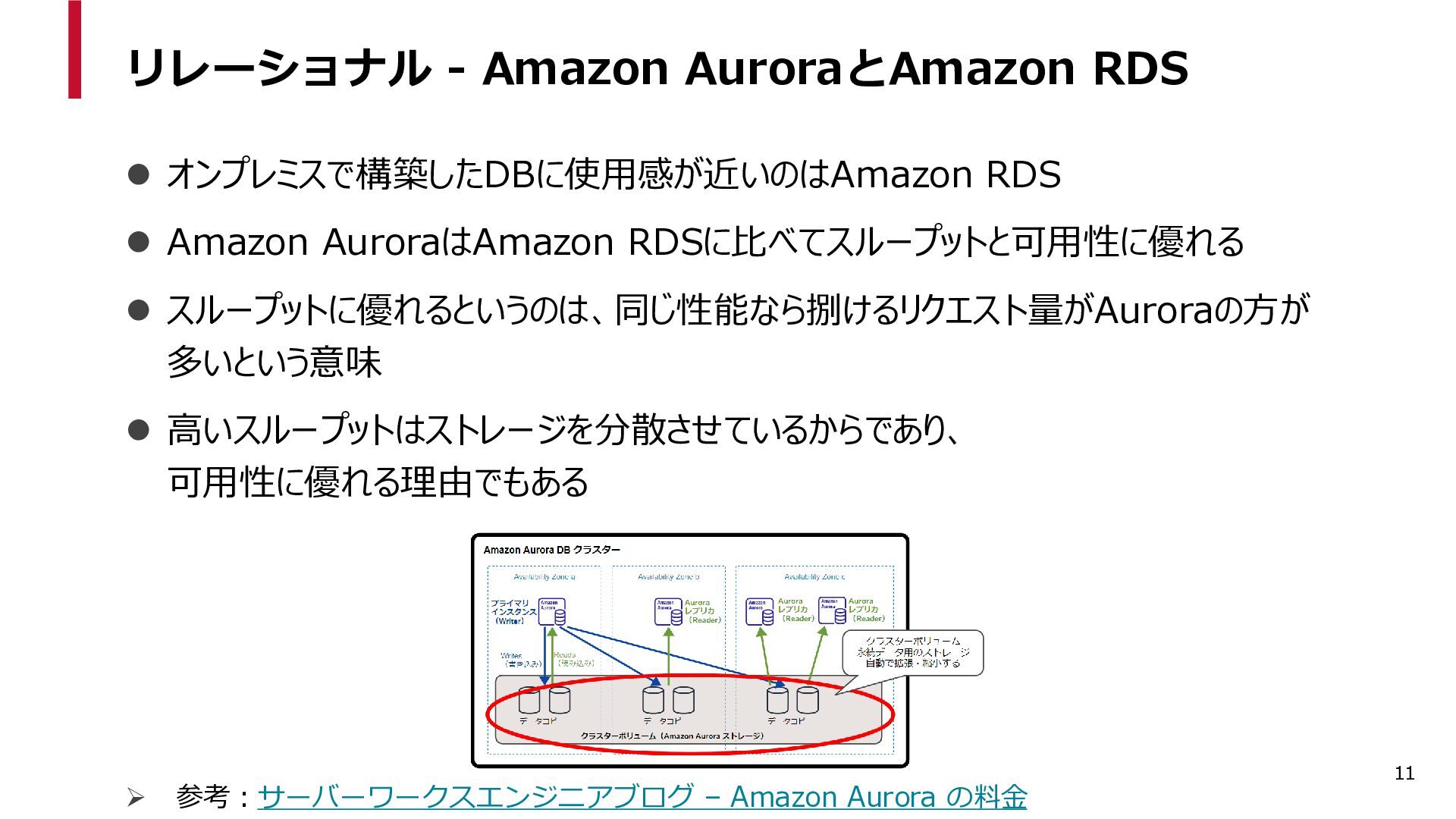 Amazon AuroraはAmazon RDSに比べてスループットと可用性に優れる ⚫ スループットに優れるというのは、同じ性能なら捌けるリクエスト量がAuroraの方が 多いという意味 ⚫ 高いスループットはストレージを分散させているからであり、 可用性に優れる理由でもある ➢ 参考:サーバーワークスエンジニアブログ – Amazon Aurora の料金
