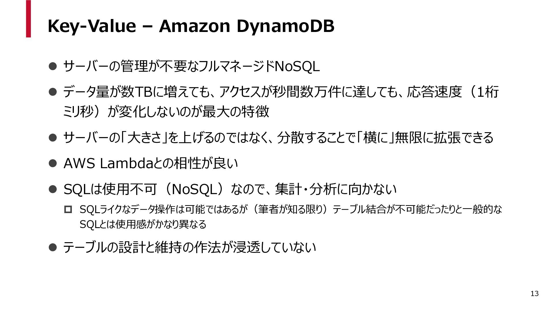 ⚫ サーバーの「大きさ」を上げるのではなく、分散することで「横に」無限に拡張できる ⚫ AWS Lambdaとの相性が良い ⚫ SQLは使用不可(NoSQL)なので、集計・分析に向かない  SQLライクなデータ操作は可能ではあるが(筆者が知る限り)テーブル結合が不可能だったりと一般的な SQLとは使用感がかなり異なる ⚫ テーブルの設計と維持の作法が浸透していない