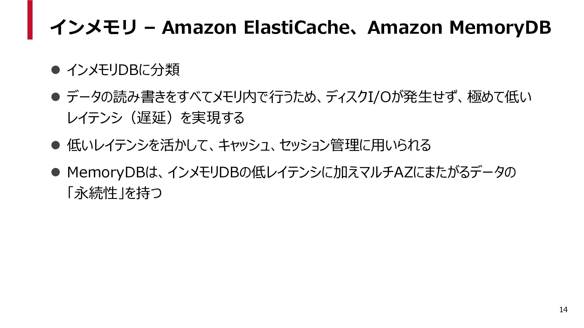 8. 14 インメモリ – Amazon ElastiCache、Amazon MemoryDB ⚫ インメモリDBに分類 ⚫ データの読み書きをすべてメモリ内で行うため、ディスクI/Oが発生せず、極めて低い