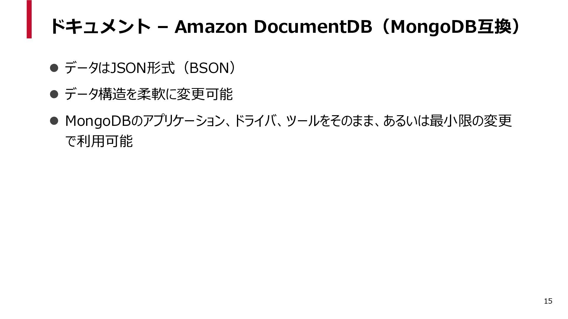 9. 15 ドキュメント – Amazon DocumentDB(MongoDB互換) ⚫ データはJSON形式(BSON) ⚫ データ構造を柔軟に変更可能 ⚫