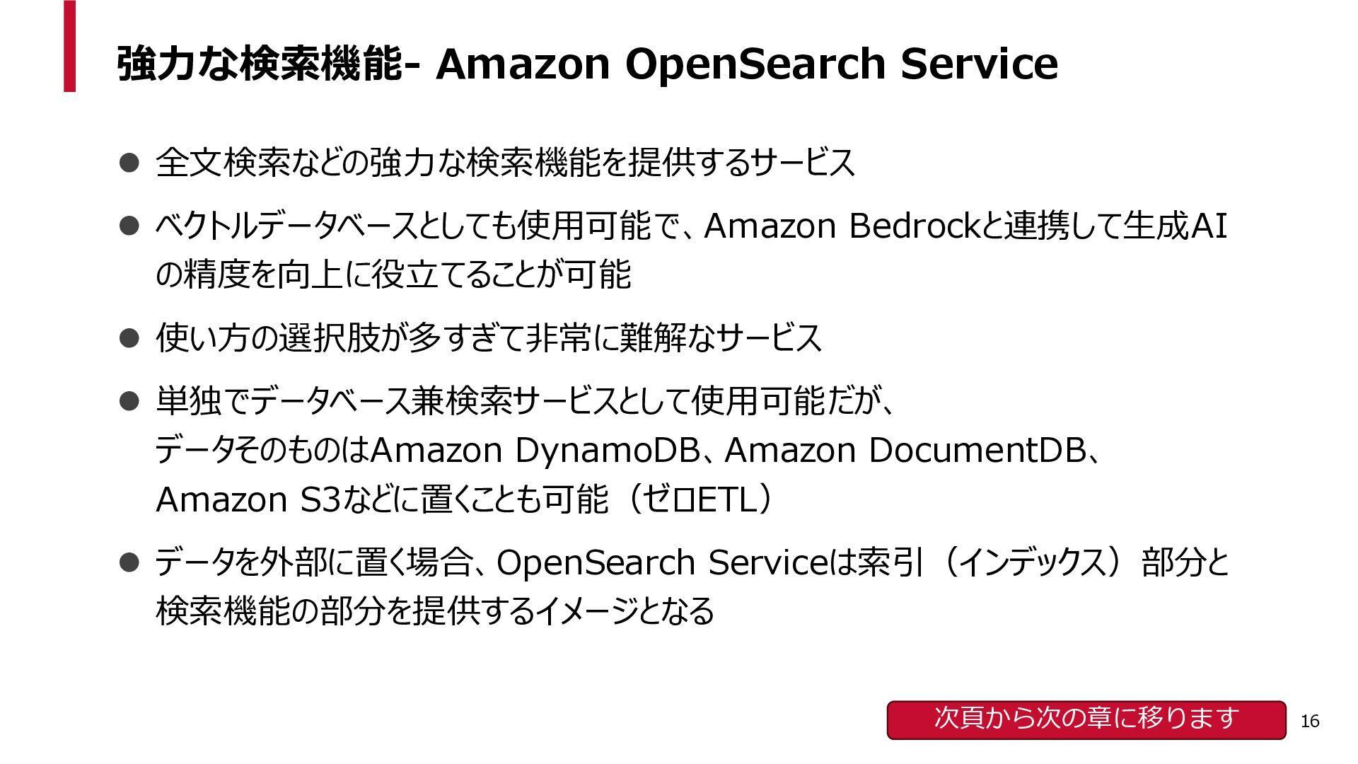 の精度を向上に役立てることが可能 ⚫ 使い方の選択肢が多すぎて非常に難解なサービス ⚫ 単独でデータベース兼検索サービスとして使用可能だが、 データそのものはAmazon DynamoDB、Amazon DocumentDB、 Amazon S3などに置くことも可能(ゼロETL) ⚫ データを外部に置く場合、OpenSearch Serviceは索引(インデックス)部分と 検索機能の部分を提供するイメージとなる 次頁から次の章に移ります