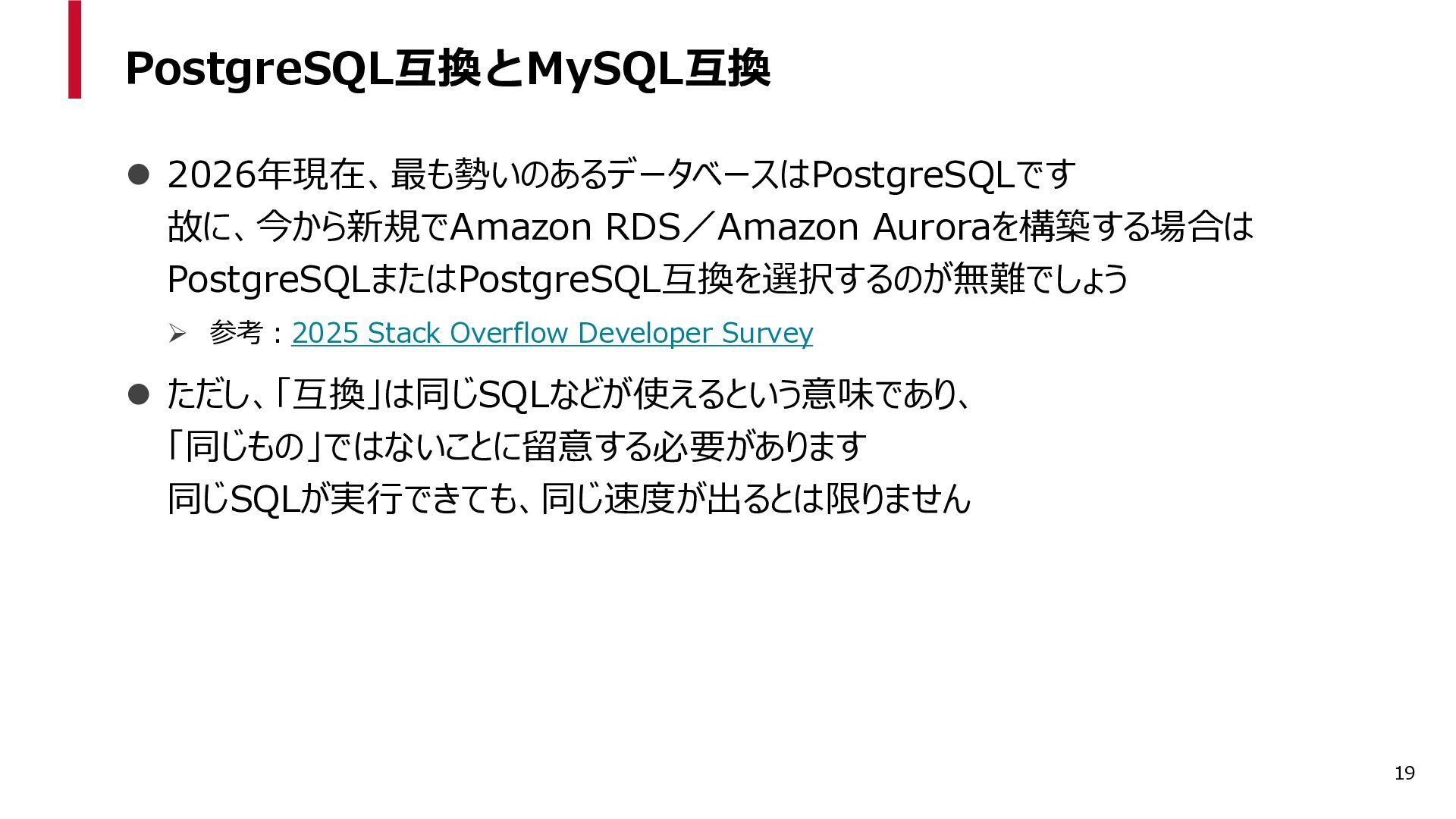 12. 19 PostgreSQL互換とMySQL互換 ⚫ 2026年現在、最も勢いのあるデータベースはPostgreSQLです 故に、今から新規でAmazon RDS/Amazon Auroraを構築する場合は PostgreSQLまたはPostgreSQL互換を選択するのが無難でしょう ➢ 参考:2025