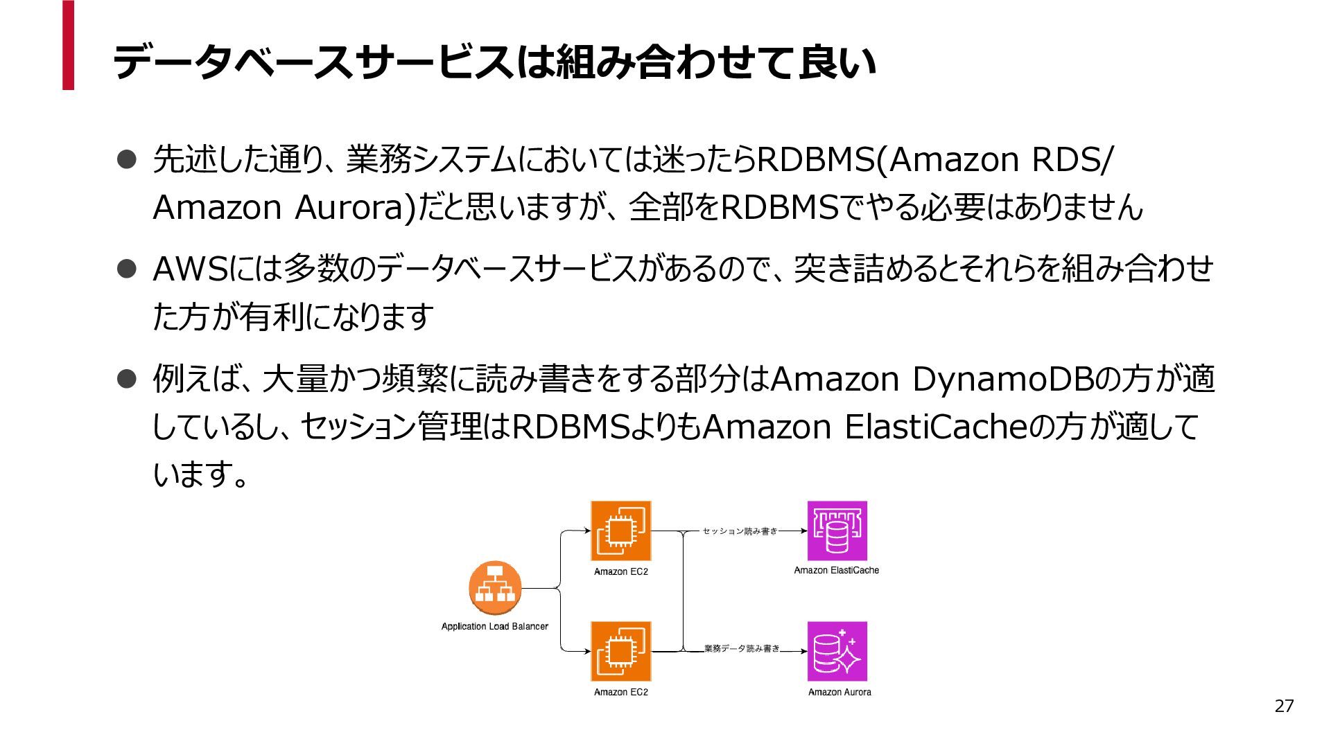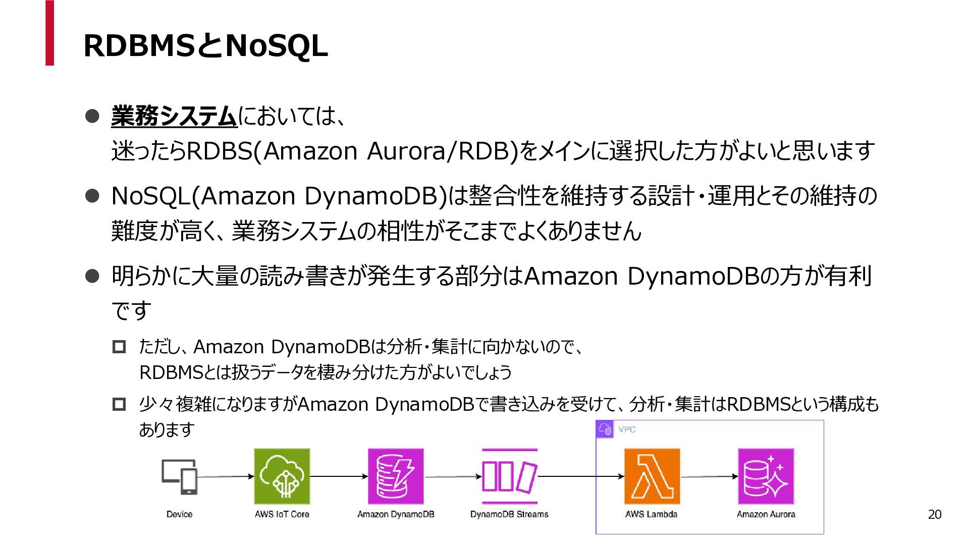 ⚫ 明らかに大量の読み書きが発生する部分はAmazon DynamoDBの方が有利 です  ただし、Amazon DynamoDBは分析・集計に向かないので、 RDBMSとは扱うデータを棲み分けた方がよいでしょう  少々複雑になりますがAmazon DynamoDBで書き込みを受けて、分析・集計はRDBMSという構成も あります
