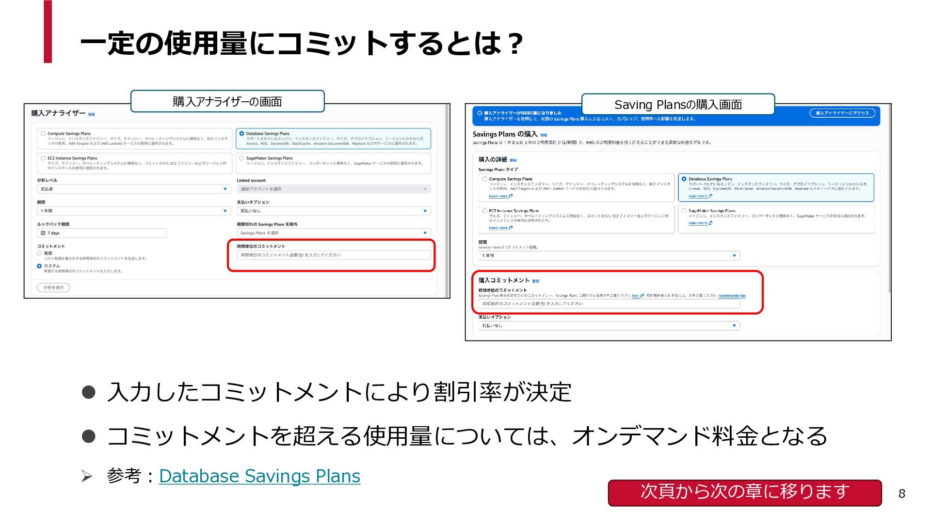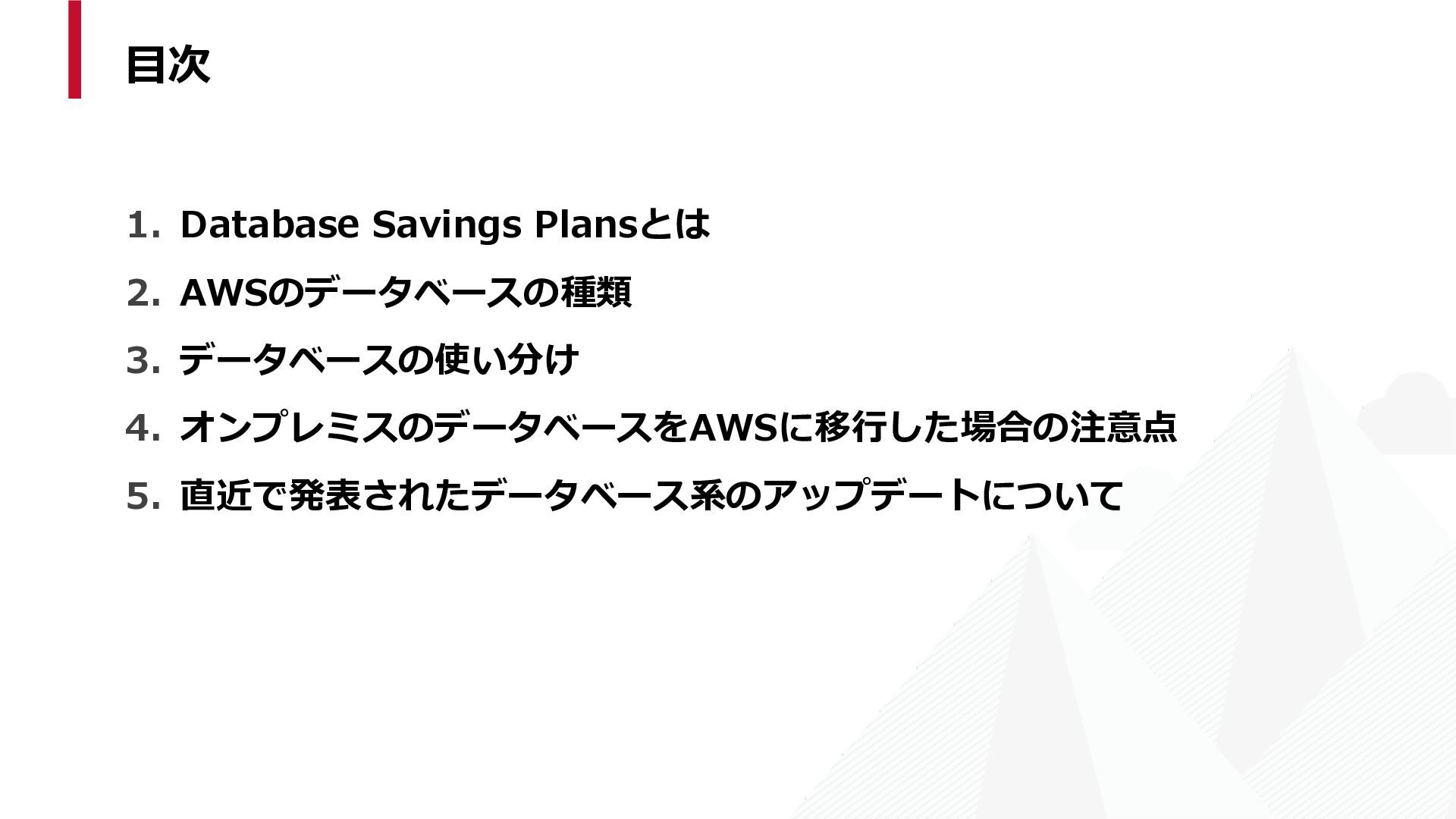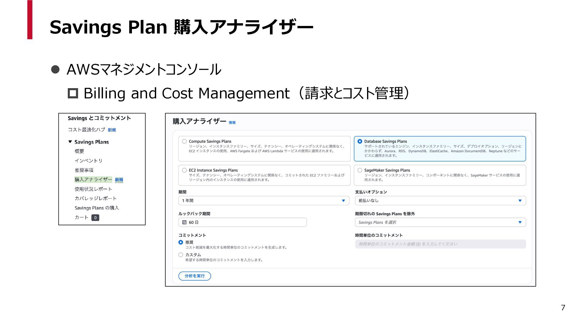 2. 5 DBサービス群を対象とした柔軟な料金プラン ⚫ Database Savings Plansはデータベースサービス群を対象とした料金プラン ⚫ 1年期間で一定の使用量にコミットする場合に、最大35%の削減が適用 ⚫ アマゾンウェブサービス(AWS)のデータベースの費用を抑える方法として、