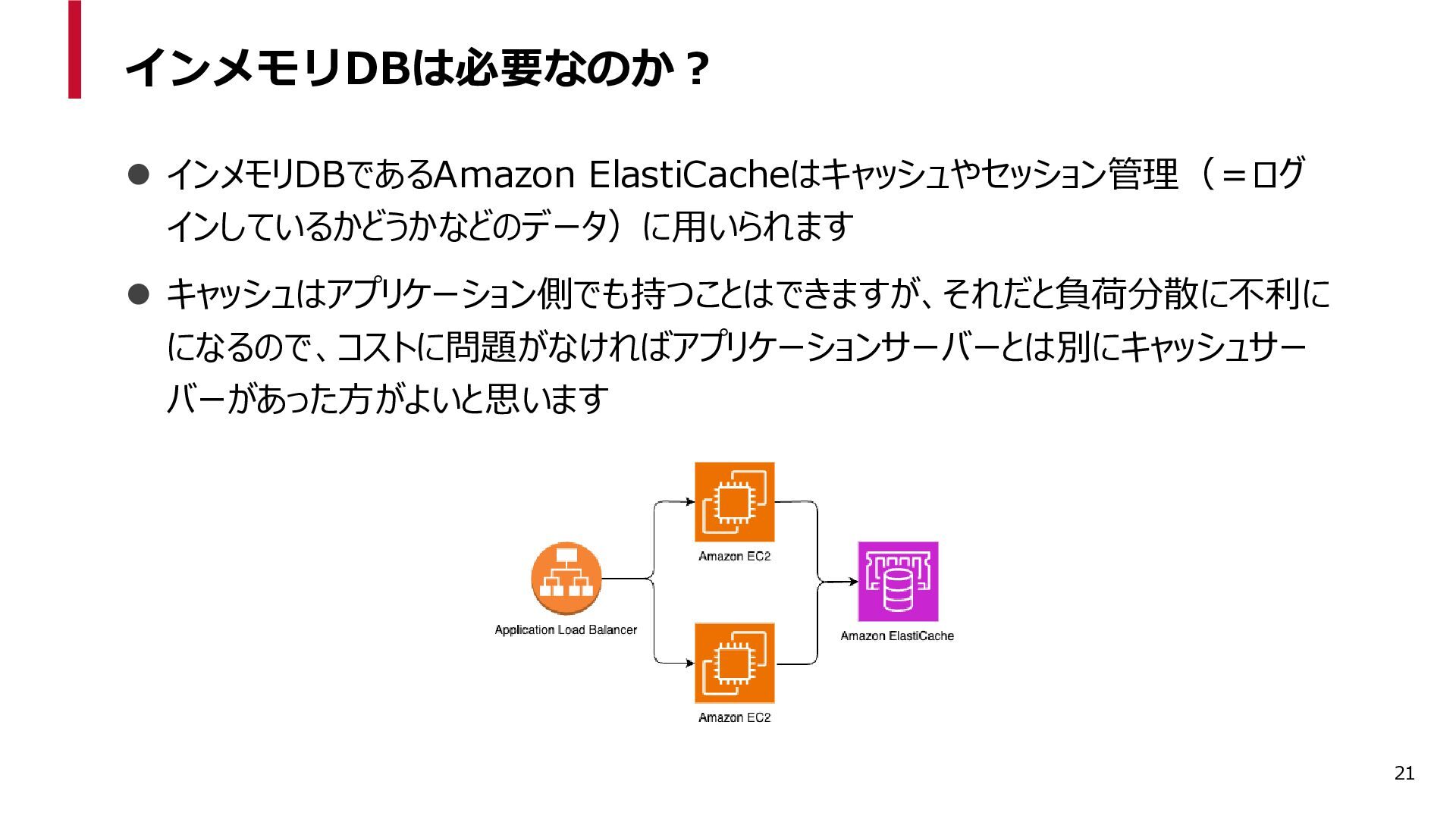 13. 20 RDBMSとNoSQL ⚫ 業務システムにおいては、 迷ったらRDBS(Amazon Aurora/RDB)をメインに選択した方がよいと思います ⚫ NoSQL(Amazon DynamoDB)は整合性を維持する設計・運用とその維持の 難度が高く、業務システムの相性がそこまでよくありません