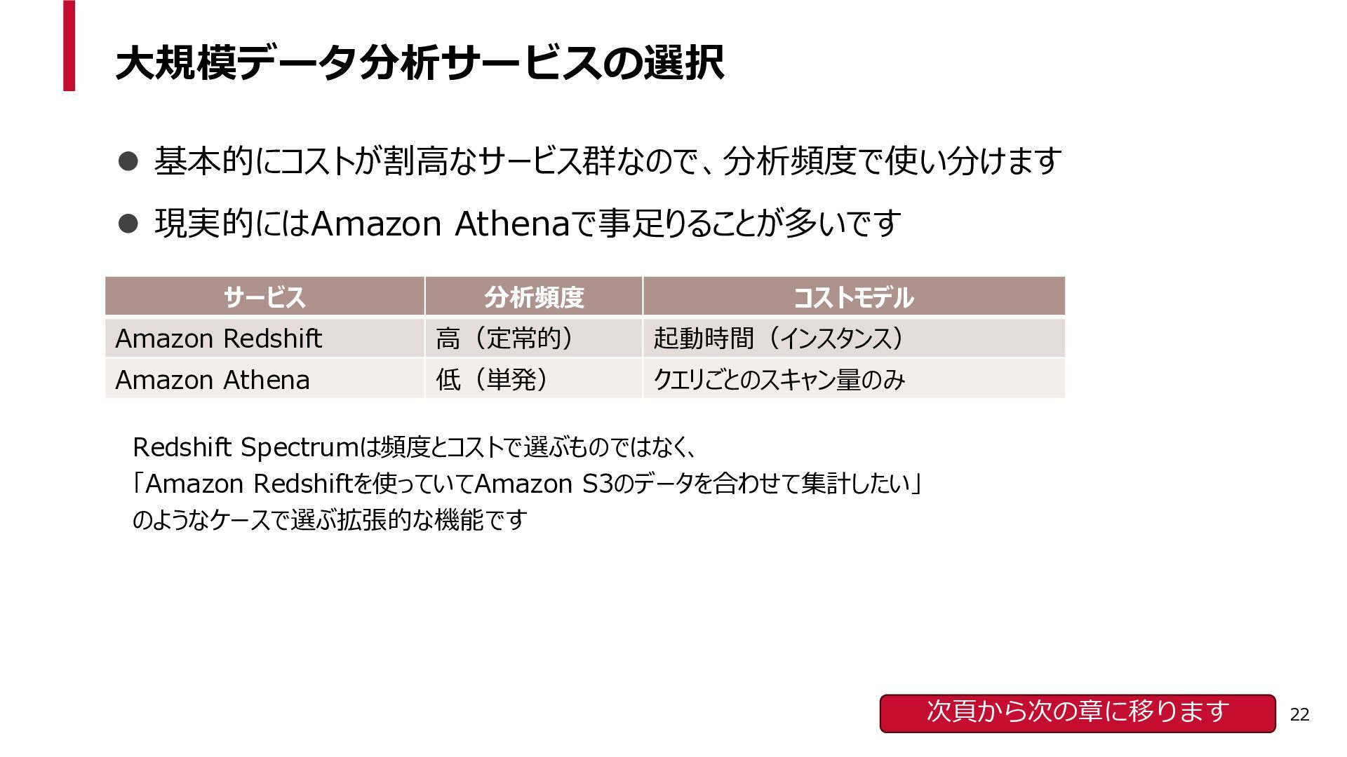 Amazon Redshift 高(定常的) 起動時間(インスタンス) Amazon Athena 低(単発) クエリごとのスキャン量のみ Redshift Spectrumは頻度とコストで選ぶものではなく、 「Amazon Redshiftを使っていてAmazon S3のデータを合わせて集計したい」 のようなケースで選ぶ拡張的な機能です 次頁から次の章に移ります