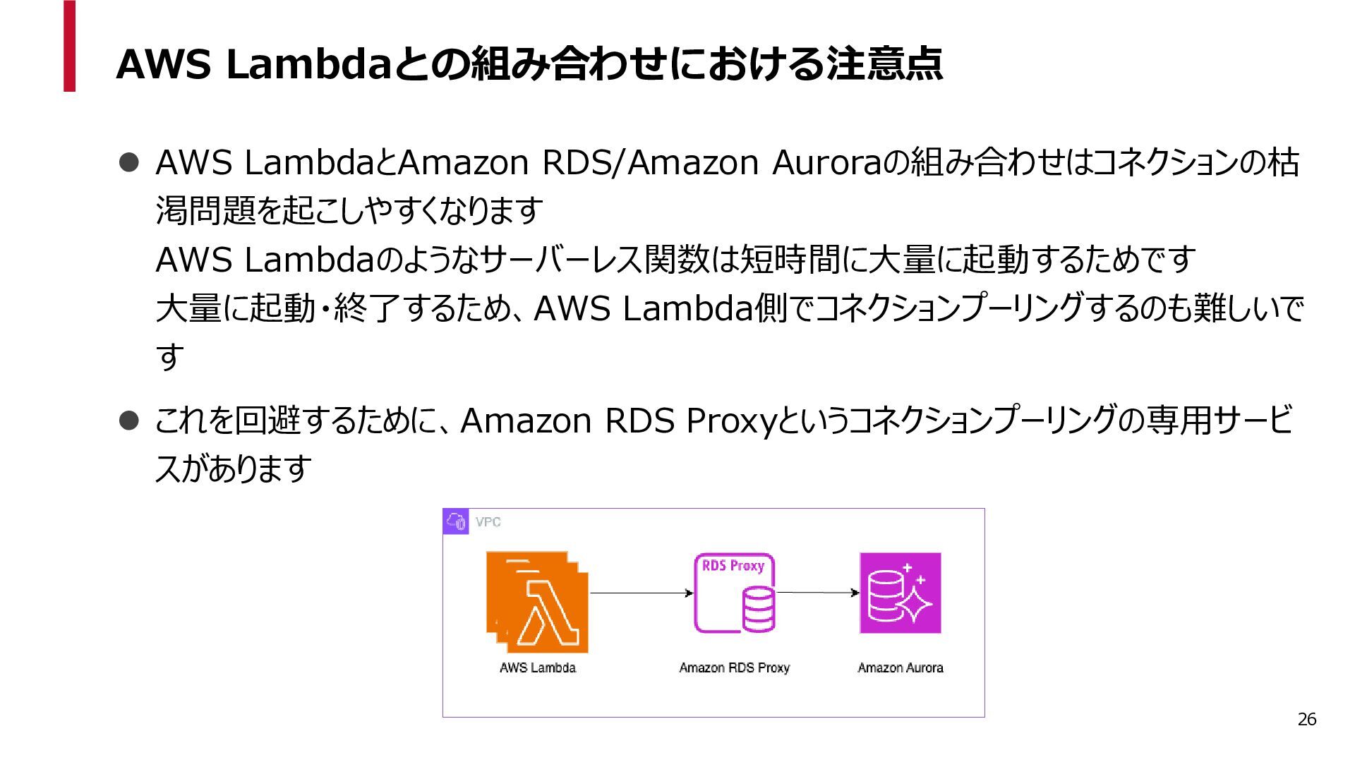 16. 26 AWS Lambdaとの組み合わせにおける注意点 ⚫ AWS LambdaとAmazon RDS/Amazon Auroraの組み合わせはコネクションの枯 渇問題を起こしやすくなります AWS