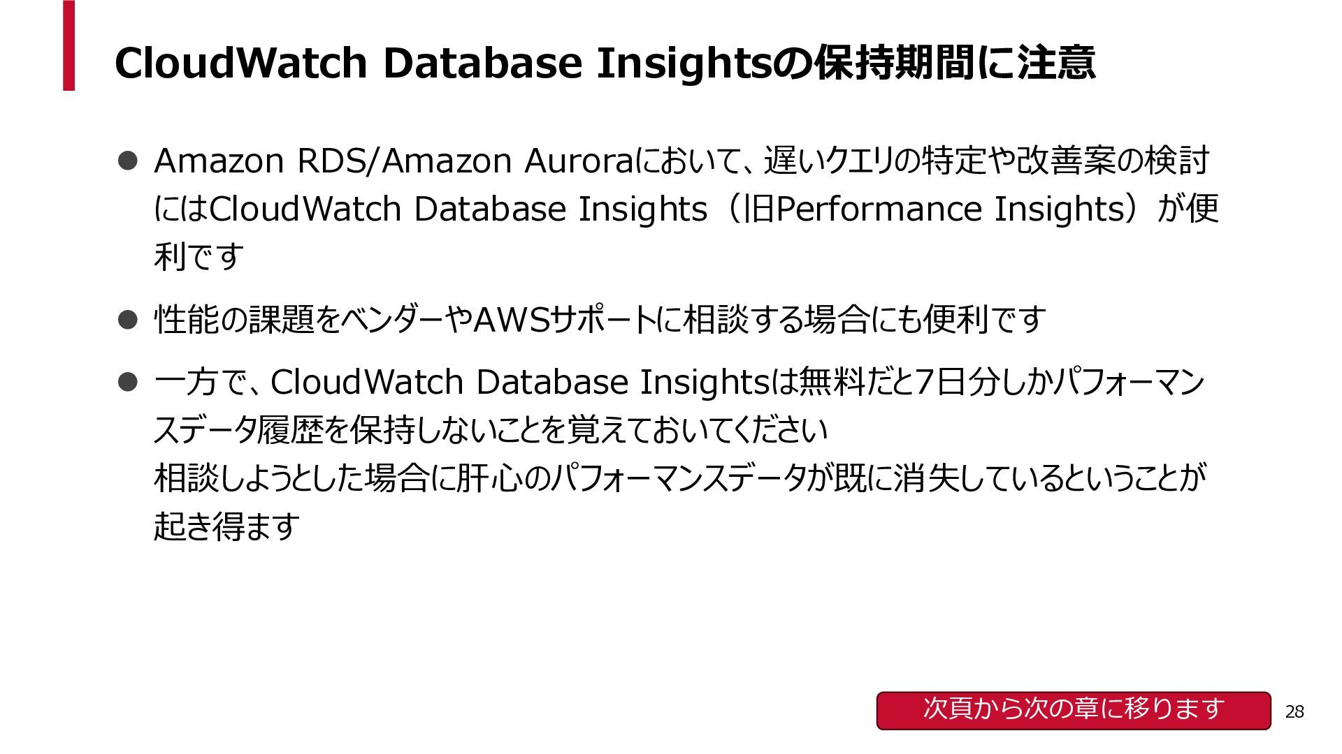Insights(旧Performance Insights)が便 利です ⚫ 性能の課題をベンダーやAWSサポートに相談する場合にも便利です ⚫ 一方で、CloudWatch Database Insightsは無料だと7日分しかパフォーマン スデータ履歴を保持しないことを覚えておいてください 相談しようとした場合に肝心のパフォーマンスデータが既に消失しているということが 起き得ます 次頁から次の章に移ります