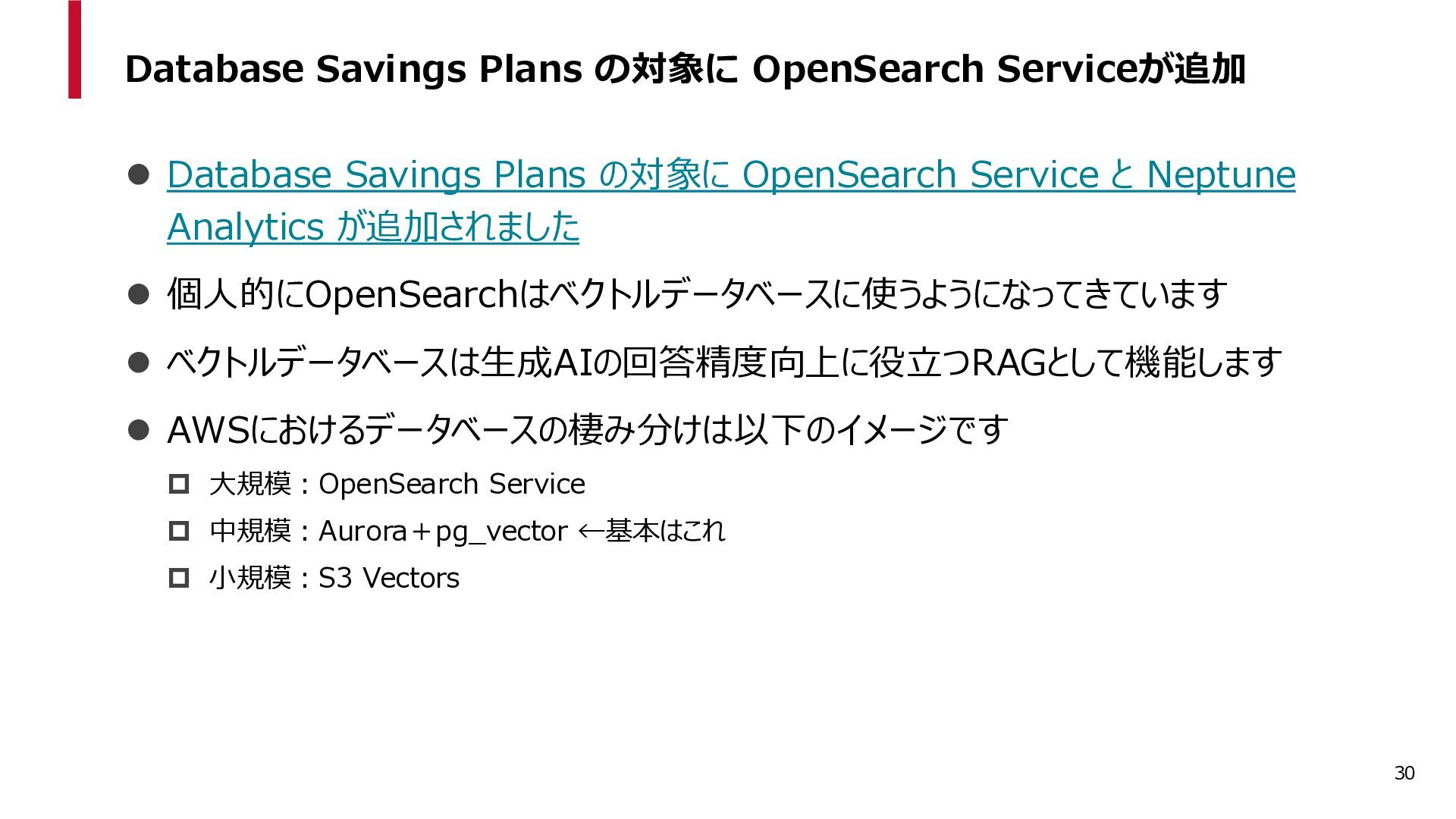 Plans の対象に OpenSearch Service と Neptune Analytics が追加されました ⚫ 個人的にOpenSearchはベクトルデータベースに使うようになってきています ⚫ ベクトルデータベースは生成AIの回答精度向上に役立つRAGとして機能します ⚫ AWSにおけるデータベースの棲み分けは以下のイメージです  大規模:OpenSearch Service  中規模:Aurora+pg_vector ←基本はこれ  小規模:S3 Vectors