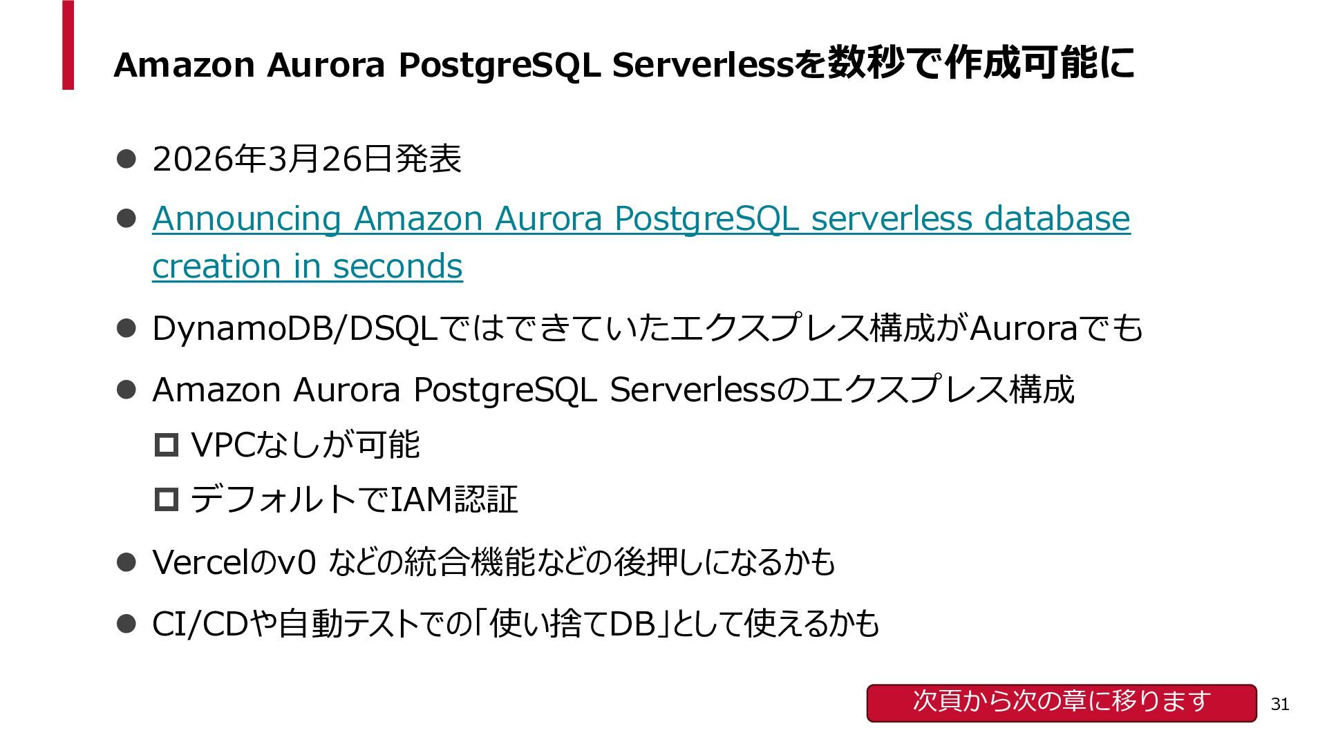 Aurora PostgreSQL serverless database creation in seconds ⚫ DynamoDB/DSQLではできていたエクスプレス構成がAuroraでも ⚫ Amazon Aurora PostgreSQL Serverlessのエクスプレス構成  VPCなしが可能  デフォルトでIAM認証 ⚫ Vercelのv0 などの統合機能などの後押しになるかも ⚫ CI/CDや自動テストでの「使い捨てDB」として使えるかも 次頁から次の章に移ります