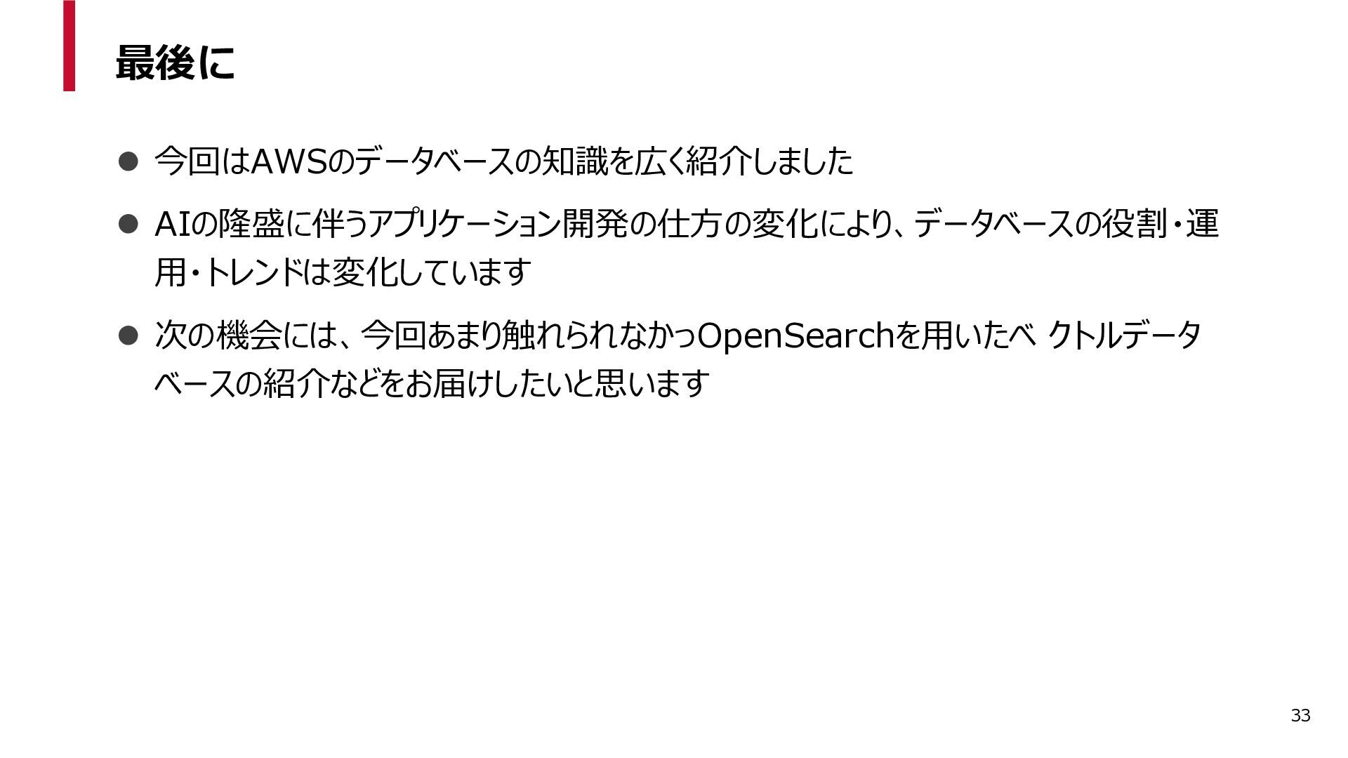 リレーショナル 基幹システム、ECサイト(頻繁な書き込み・読み込み) Amazon Aurora ◦ Amazon RDS ◦ データウェアハウス 大規模分析、BIツール連携(数億件の集計処理) Amazon Redshift Key-Value 高トラフィックのWEBアプリケーション Amazon DynamoDB ◦ インメモリ キャッシュ、セッション管理 Amazon ElastiCache ◦ Amazon MemoryDB ドキュメント コンテンツ管理、カタログ、ユーザープロファイル Amazon DocumentDB (MongoDB互換) ◦ グラフ 不正検出、ソーシャルネットワーキング、レコメンデーションエンジン Amazon Neptune ◦ ワイドカラム 高スケールの業界アプリケーション、設備のメンテナンス Amazon Keyspaces ◦ 時系列 (IoT) アプリケーション、産業用テレメトリ Amazon Timestream ◦ 検索・分析 全文検索、ログ分析、ベクトル検索(AI連携) Amazon OpenSearch Service ◦ 分散データベース グローバルかつ高可用性を要するアプリケーション Amazon Aurora DSQL ◦