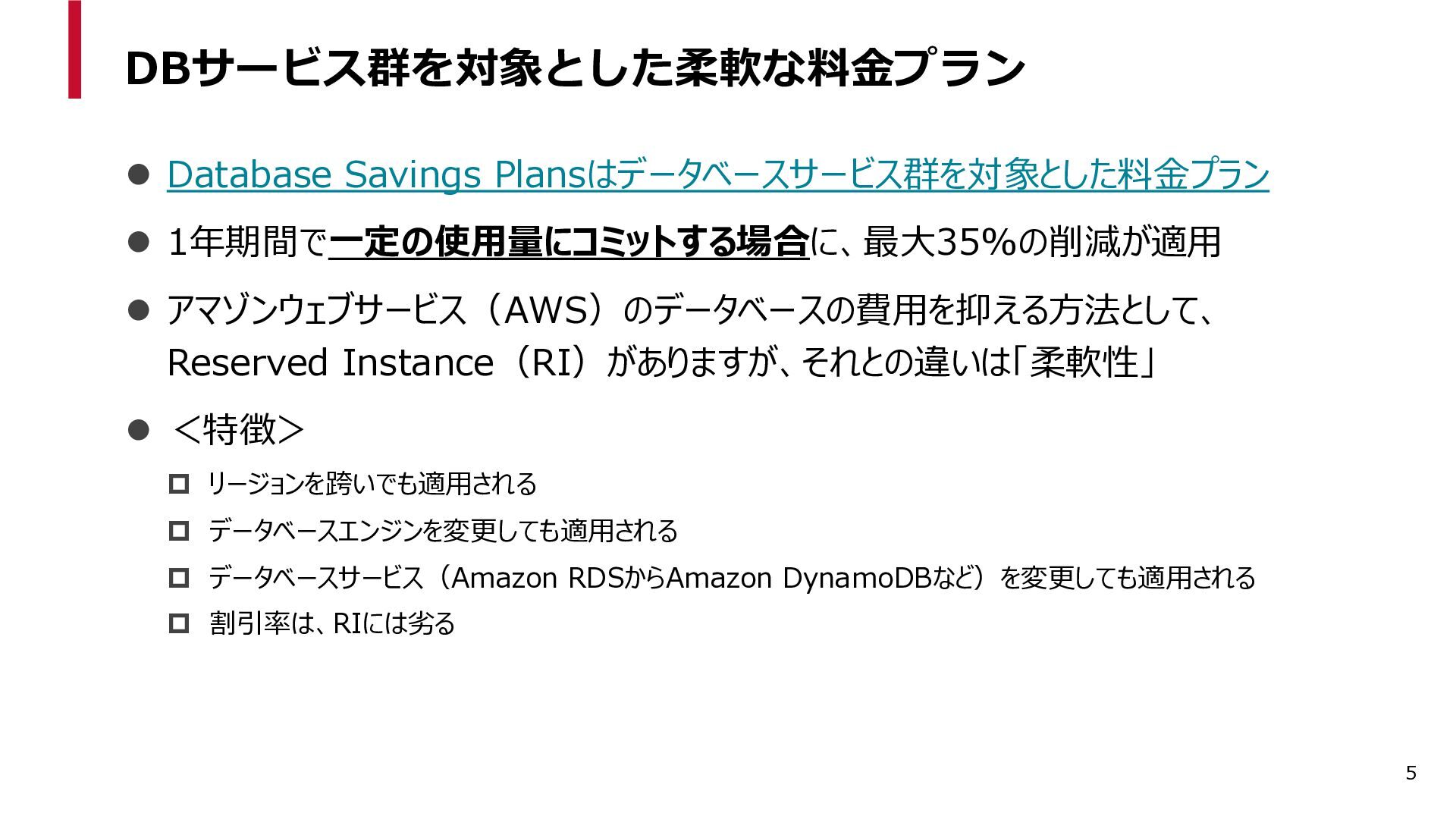 Reserved Instance(RI)がありますが、それとの違いは「柔軟性」 ⚫ <特徴>  リージョンを跨いでも適用される  データベースエンジンを変更しても適用される  データベースサービス(Amazon RDSからAmazon DynamoDBなど)を変更しても適用される  割引率は、RIには劣る