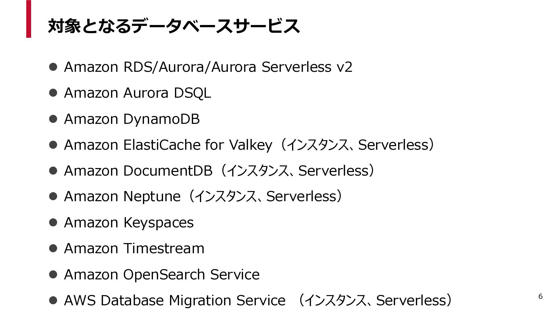 DSQL ⚫ Amazon DynamoDB ⚫ Amazon ElastiCache for Valkey(インスタンス、Serverless) ⚫ Amazon DocumentDB(インスタンス、Serverless) ⚫ Amazon Neptune(インスタンス、Serverless) ⚫ Amazon Keyspaces ⚫ Amazon Timestream ⚫ Amazon OpenSearch Service ⚫ AWS Database Migration Service (インスタンス、Serverless)