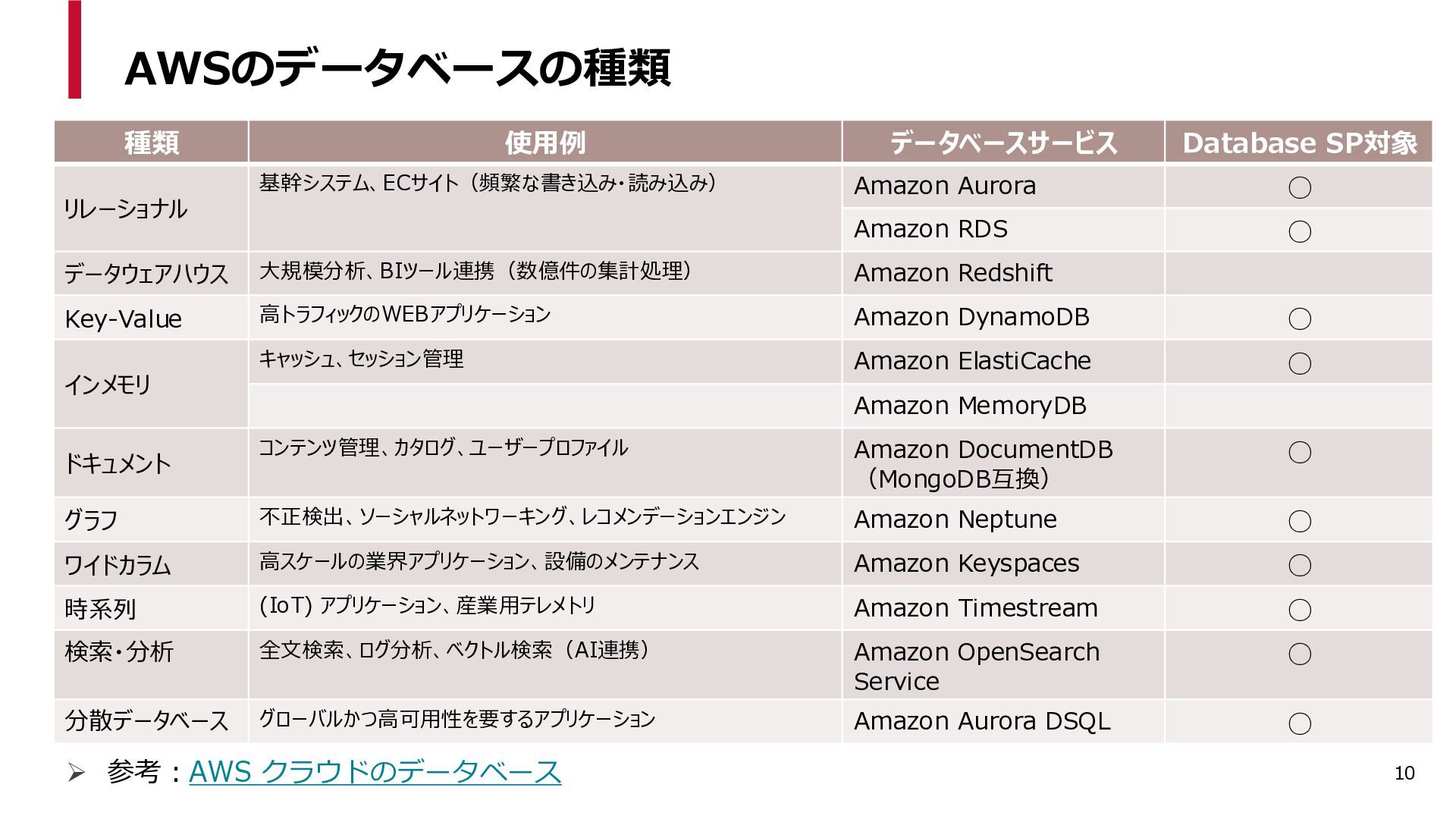 4. 10 AWSのデータベースの種類 ➢ 参考:AWS クラウドのデータベース 種類 使用例 データベースサービス Database SP対象