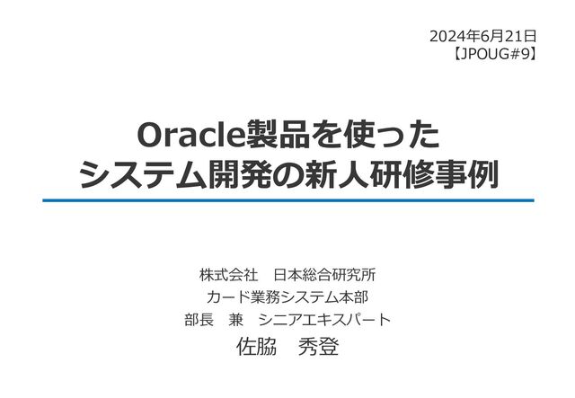 弊社の所属部署では内製開発力やトラブルシューティング力強化を目的として、新人全員それぞれに、仮想マシンの作成から Oracle Linux, Oracle Database, Oracle WebLogic Serverなどのインストールと設定をさせ、簡単なJavaアプリケーション開発を行う一気通貫のモノ作り研修を行っています。 研修の工夫点や「初期化パラメータファイルをviで変更したら、なぜかエラーメッセージが出続けて止まりません!」などのトラブルシューティング事例を紹介します。