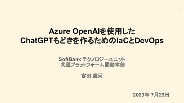 Azure OpenAIを使用した ChatGPTもどきを作るためのIaCとDevOps SoftBank テクノロジーユニット 共通プラットフォーム開発本部 宮田 銀河 1 2023年