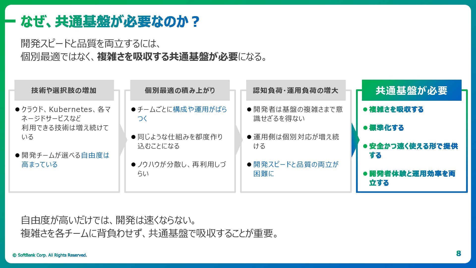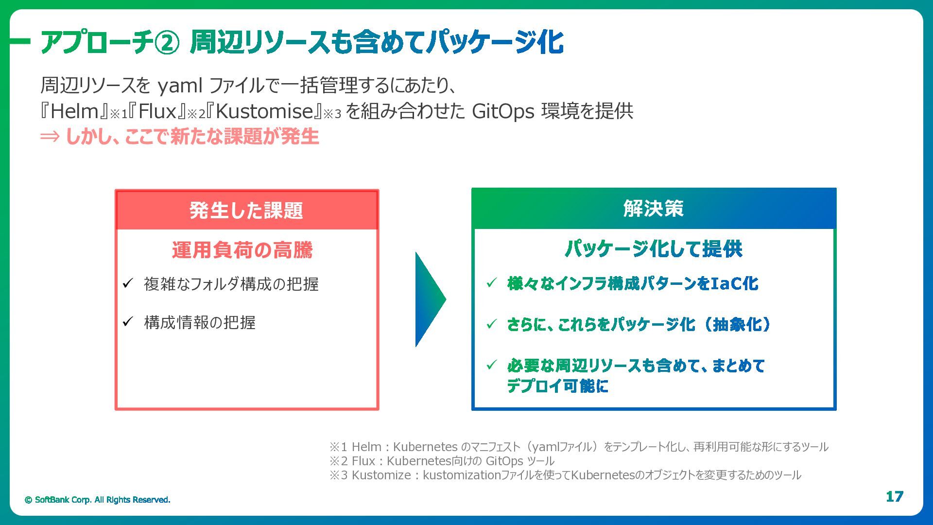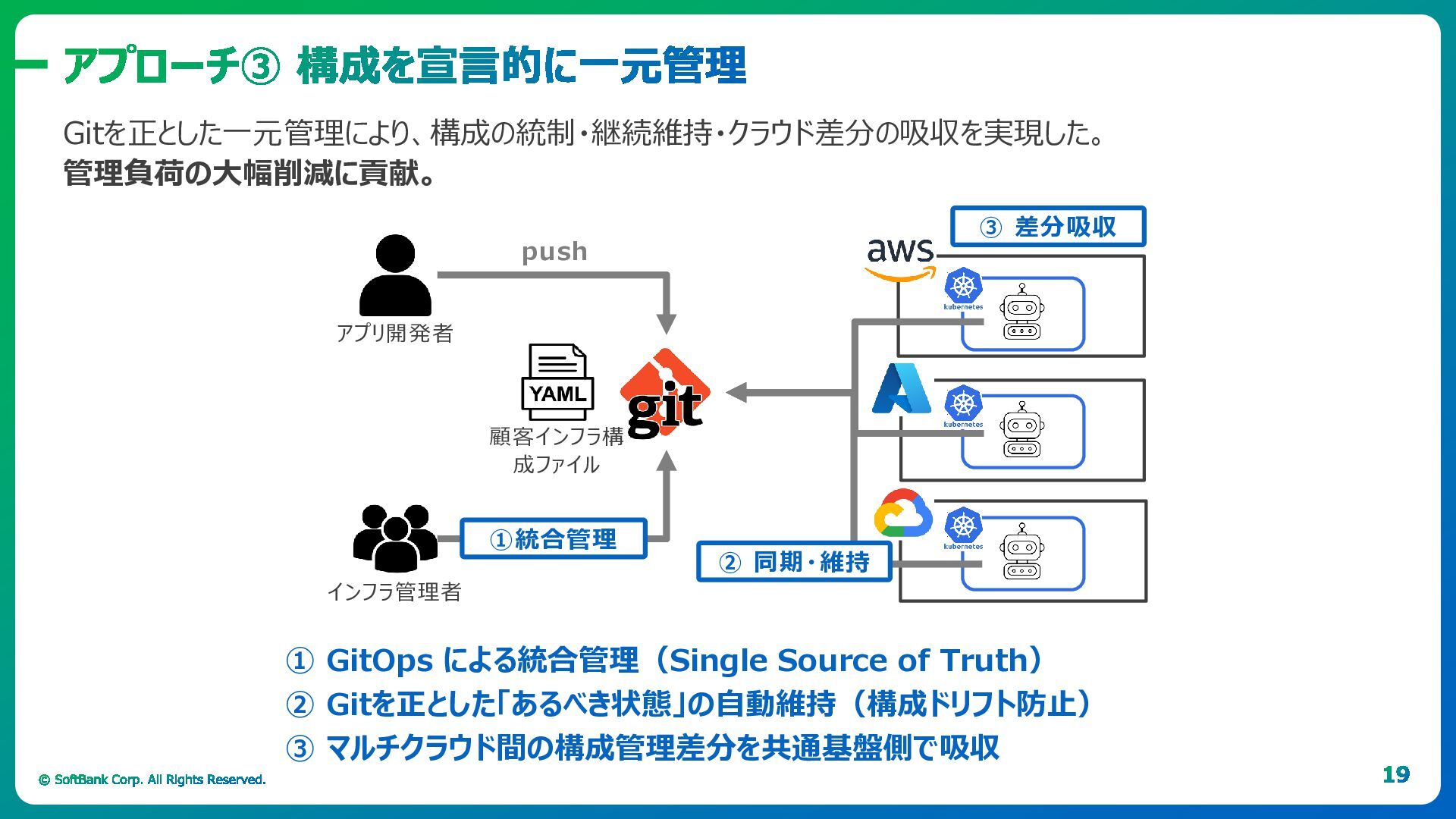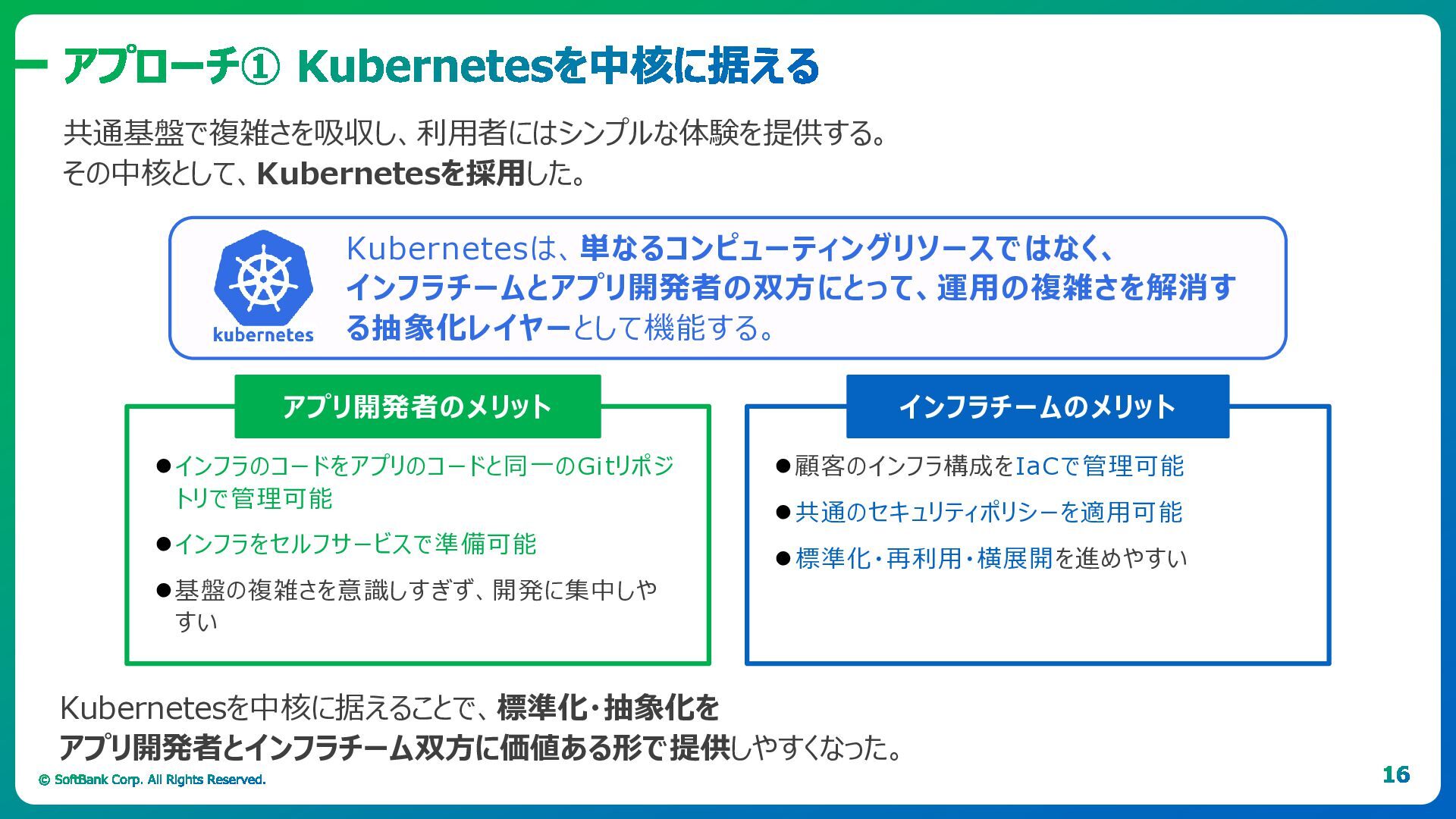 「ソフトバンク流」のポイントは、Kubernetesを単なるリソース管理基盤ではなく、運用の抽象化レイヤーとして捉えることです。