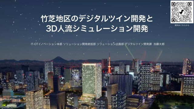 ソフトバンクでは社会課題の解決に役立つ技術として「デジタルツイン」という技術に注目しております。デジタルツインとは、バーチャル上に双子のような3D都市を作成し、様々なシミュレーションを行う技術です。私たちのチームでは、デジタル・エリアマネジメント活用を目的に、ソフトバンクが本社を置く竹芝地区のデジタルツイン開発を進めております。デジタルツイン上にビルから取得されるセンサデータを表示し、ビル管理の業務効率化の検討をしております。また、竹芝地区の3D人流シミュレーションを開発し、防災などのユースケースへの活用を検討しております。本セッションではこれらの内容に関してご紹介します。