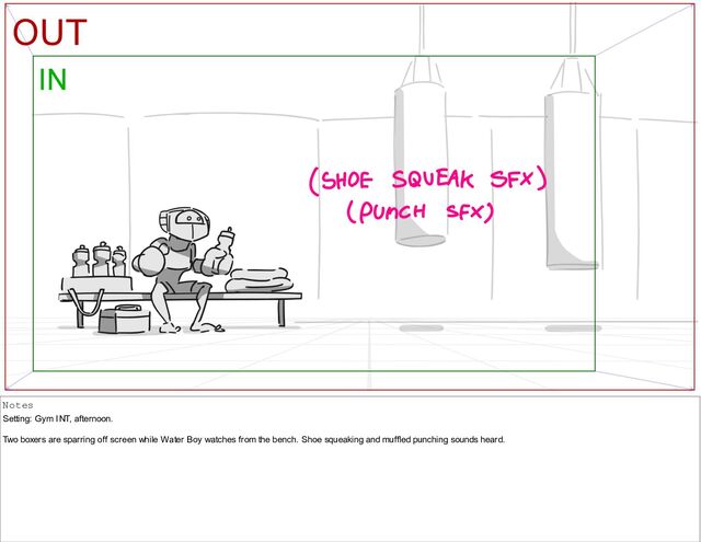 screen while Water Boy watches from the bench. Shoe squeaking and muffled punching sounds heard.