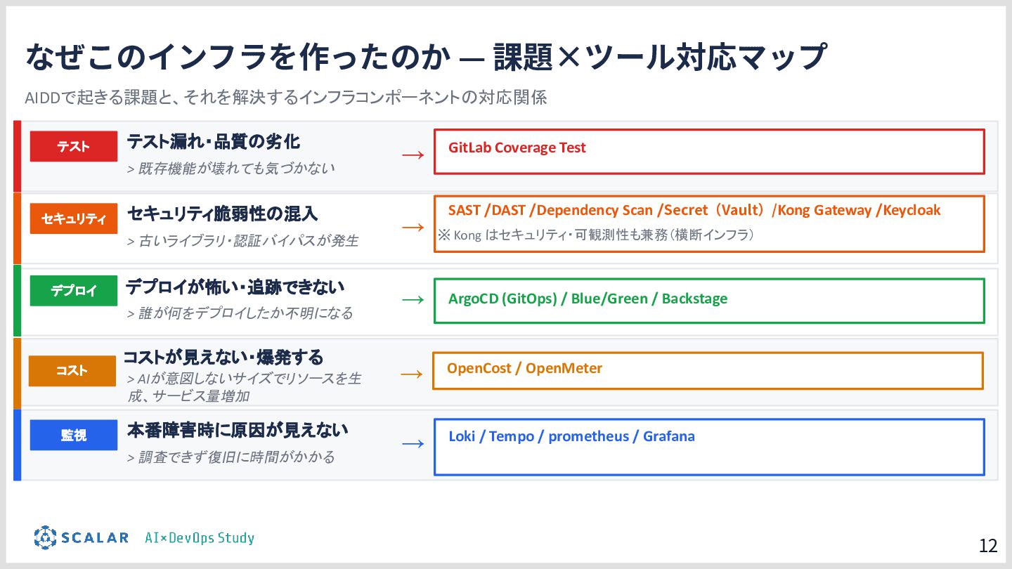 具体的には、GitLab CI/ArgoCD による全自動デプロイ、Blue/Green デプロイによるゼロダウンタイムリリース、Kong Gateway・Keycloak・HashiCorp Vault によるセキュリティ基盤、そして Loki・Tempo・Grafana を活用した可観測性スタックを取り上げます。