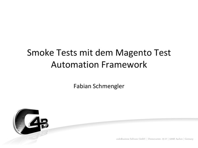 Test-Framework Erweiterung der PHPUnit_Selenium Extension für Magento Abstraktion des User Interfaces Test Suite Tests für Magento-Standard- Funktionalität 15-20 Stunden Gesamtlaufzeit Regressionstest Standard-Fixtures Helper für Standard-Aktionen