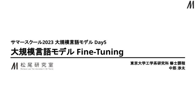 東大松尾研サマースクール2023「大規模言語モデル」Day5の講義で使用した資料です。大規模言語モデルの Fine-Tuning をテーマに、Instruction Tuning および Parameter Efficient Fine-Tuning について体系的に紹介することを目指した内容となっています。