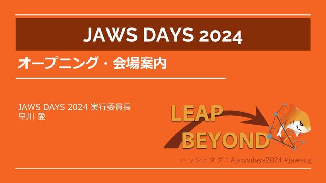 ハッシュタグ:#jawsdays2024 #jawsug いつもとは違うコミュニティの人たちと触れあう場を提供することで、 新しい繋がりやチャレンジを生み出し、日本でイノベーションを起こしたい! テーマ:LEAP BEYOND